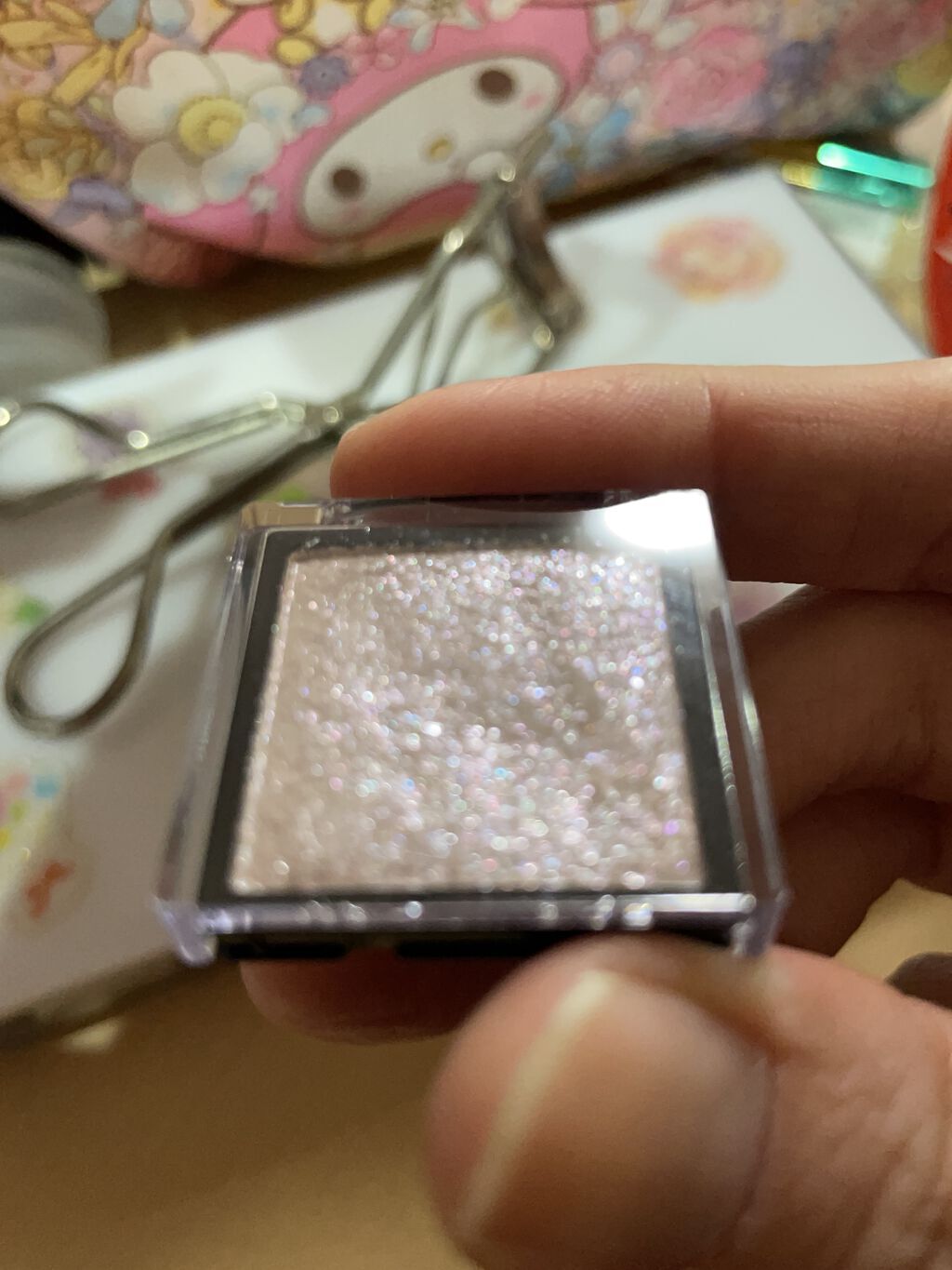 色もくすみないし、上から2番目の色は若干オーロラ?っぽい輝きが見えます✨ ラメもかなりキラキラで、 右下のカラーがアクセントラメカラーでかなり濃い! 黒目の上とか涙袋ようじゃなさそうだ、アイラインのすぐ側に沿わせるのが綺麗かもしれない‼️ 涙袋と黒目上はまた違うのを使おうかなー^_^