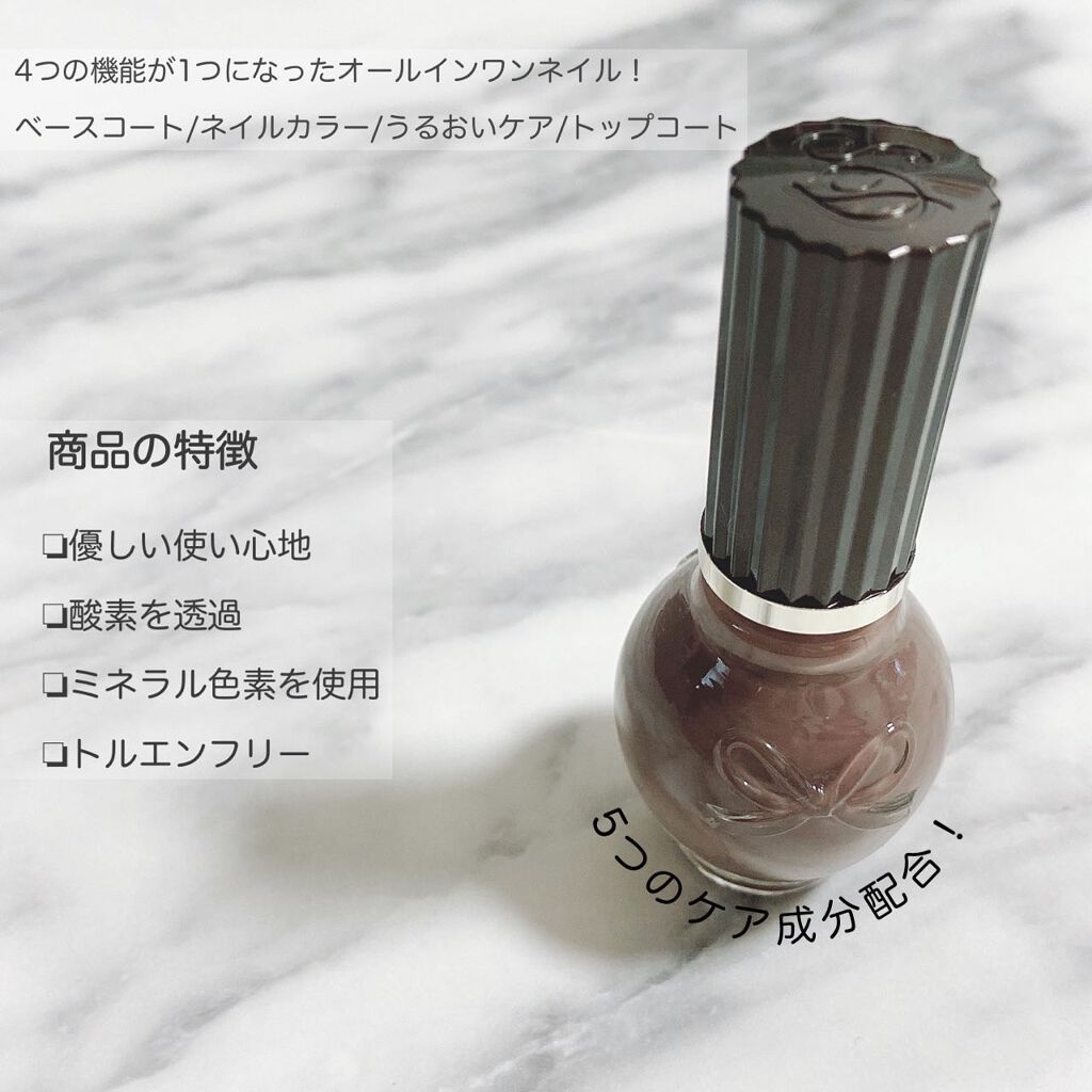 - ※パッケージ順次リニューアル。尚、リニューアルにかかる返品交換等は承っておりません。 これ1本で上品ナチュラルなツメ美人に! ひと塗りで、気になる縦ジワ・凹凸もつるんと補整し、ジェルのようなぷるツヤ仕上げ。 カンタンに、お手入れ感のある爪先がかないます。 シーンを選ばず使いやすいベーシックなカラーライナップ。 ・4つの機能が1つになったオールインワンネイル ベースコート・・・凹凸縦ジワ補整 ネイルカラー・・・ミネラル色素使用 ほんのり血色感UP うるおいケア・・・爪にもうるおい トップコート・・・上品なぷるツヤ仕上げ