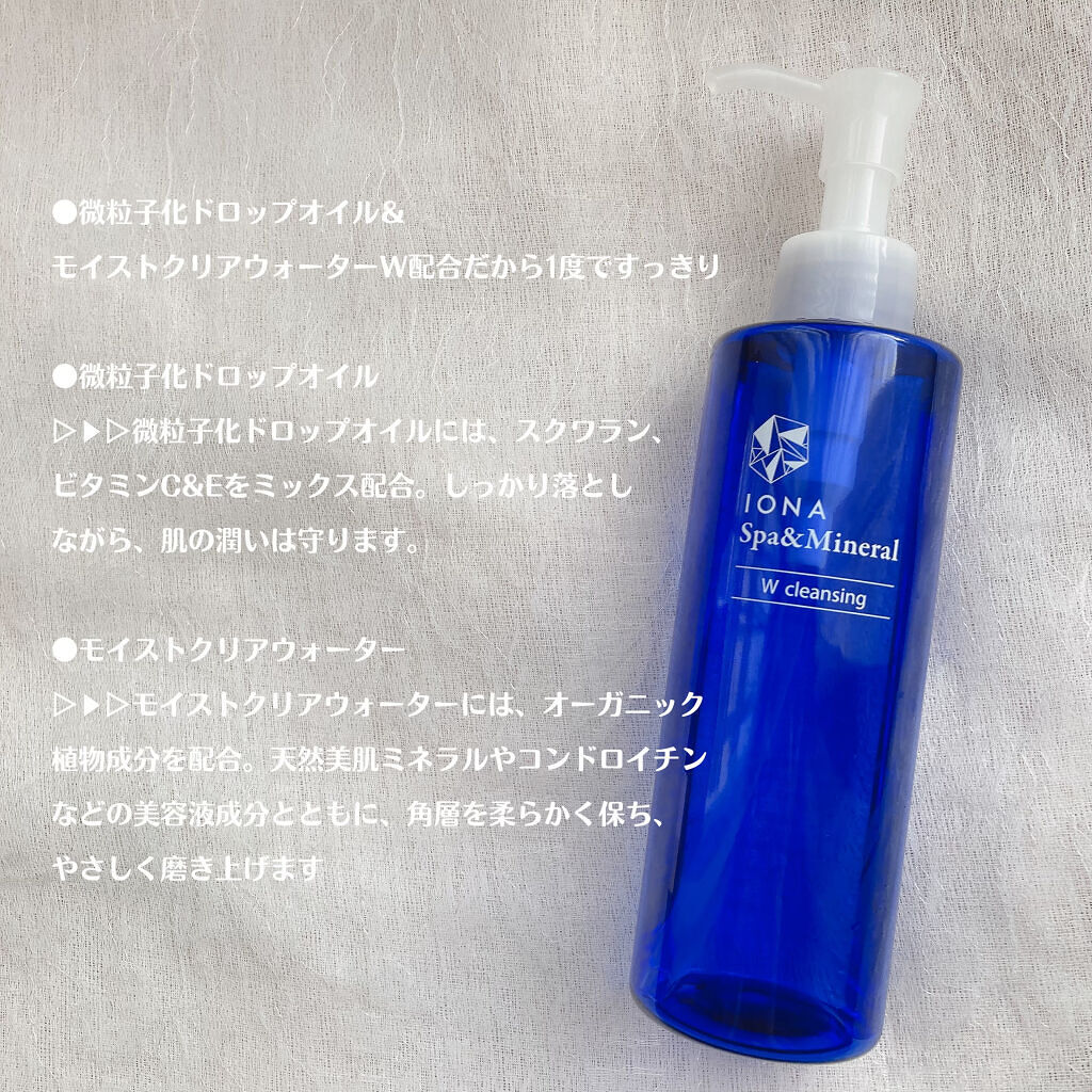 イオナスパ&ミネラルさまよりいただきました。Wクレンジングを使わせていただきました🤍\スパ発想の贅沢ミネラルケア!/透明でとろみも感じられるようなさらさらとしてみずみずしいテクスチャー✨肌に塗布すると、とろりとしたオイルのような感じがしたと思...