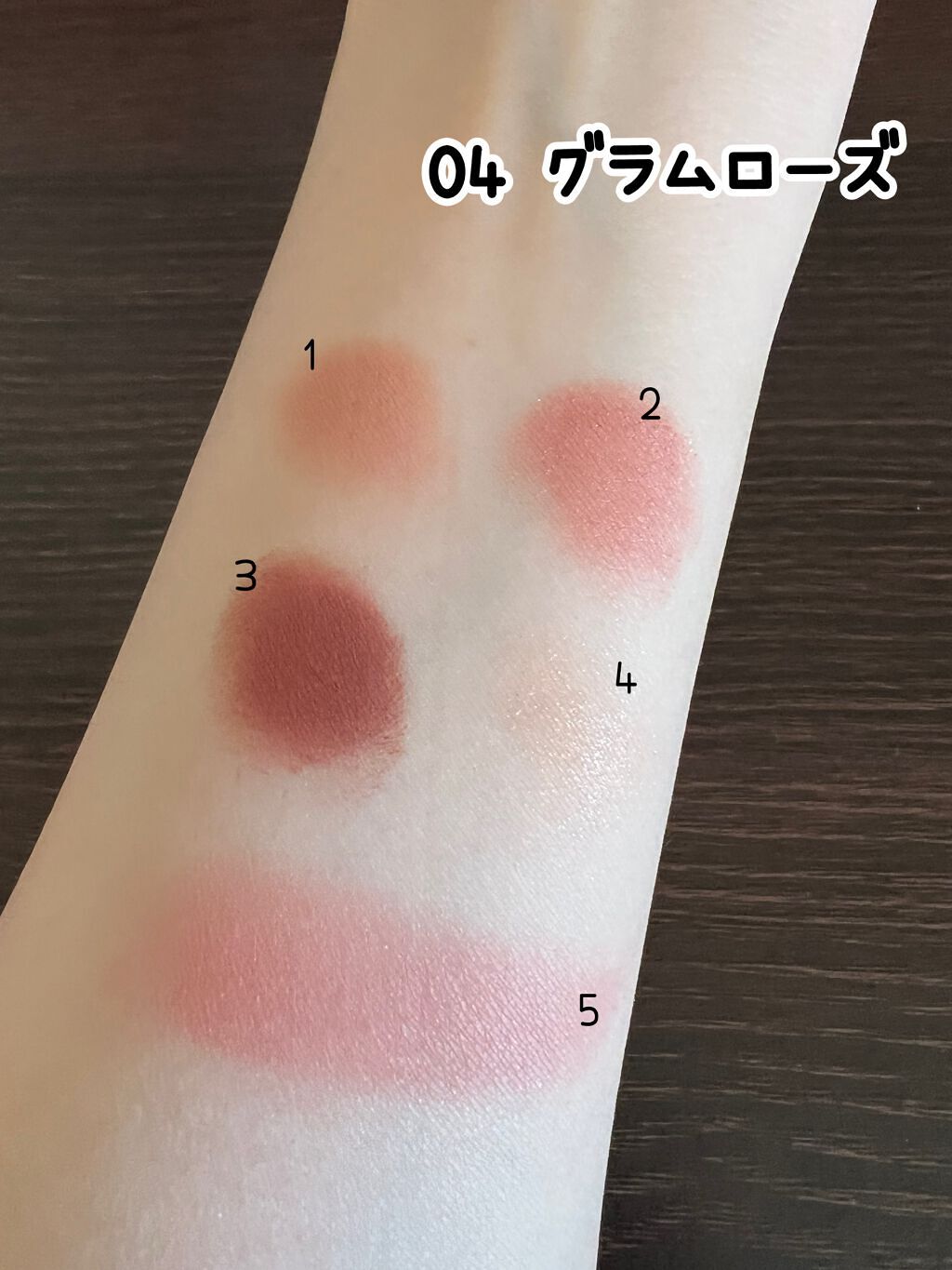 アイシャドウとチークのセットになっているのに、手に収まるコンパクトサイズです。 数字が彫ってあるので、私みたいなメイク初心者でも使いやすいと思います!! 普段の日や特別な日のメイクの仕方が箱裏に載っているので助かります🙇♀️ 各、1・3番はマット 2・4番はラメ 5番はチーク になっています。 ※ 03ベイクドジンジャーのチークの色が写真だとベージュに見えますが、実際はオレンジ系の色味になっています。