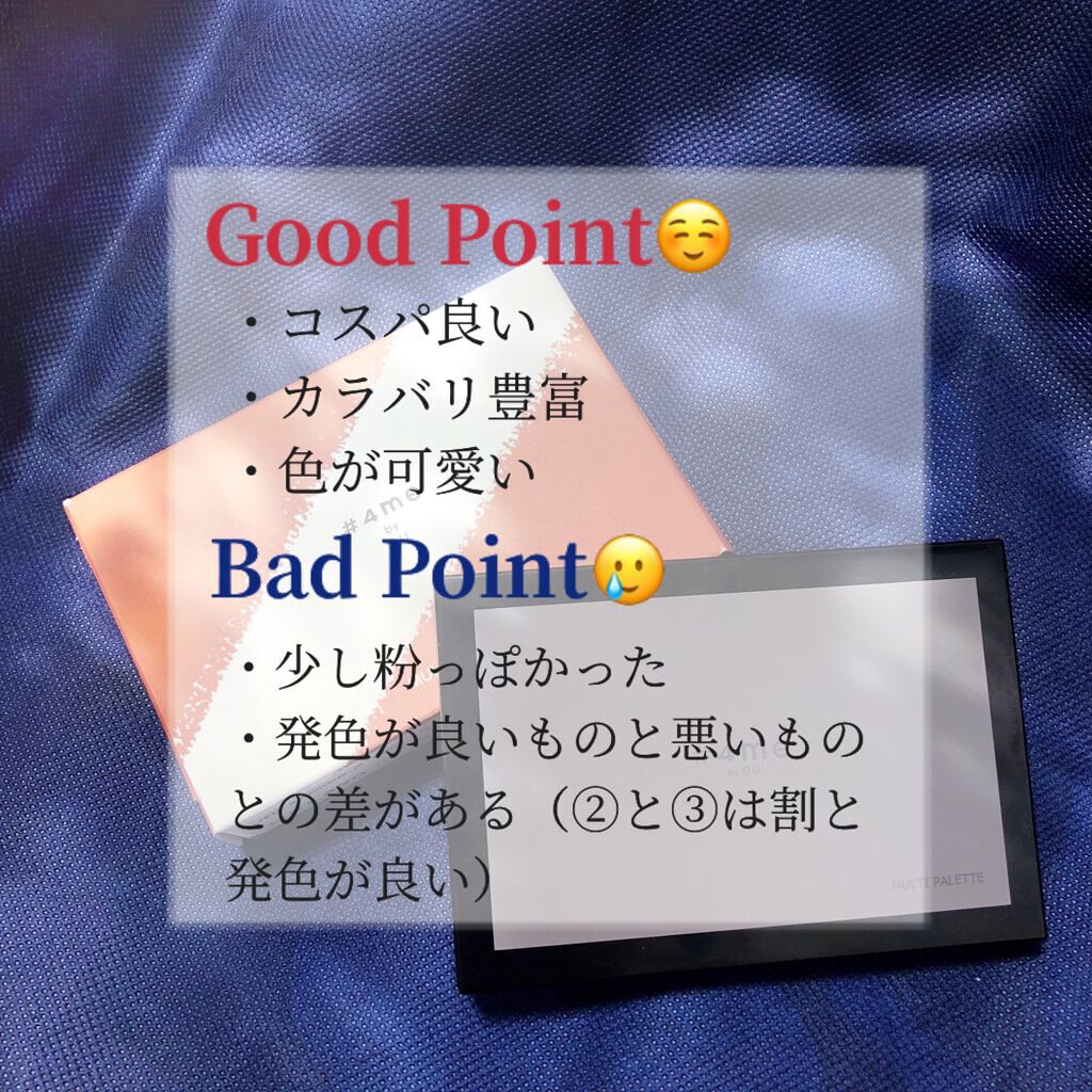 今日初めて使ってみたのですが、ベースに薄い茶色を使ったので、混ざって変な色?(紫がほとんど分からなかった)になってしまいました🙈 せっかく綺麗な色なので今度はちゃんと紫が分かるようにメイクしたいと思います!😂😂 今回使ってみて発色はいまいちですが、190円でこのクオリティーは凄いと思います⭐(元は590円) パッケージも透明感があってかわいいです💕