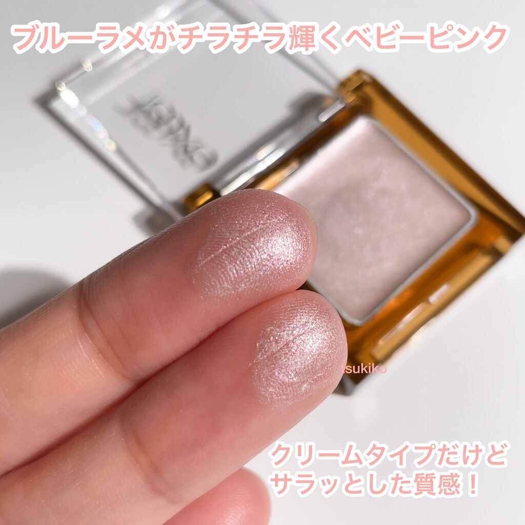 細かいラメがちらちら輝いて ベースのカラーが透明感たっぷり アイシャドウベースとして使っています 重ねるパウダーアイシャドウのモチや密着が良くなるのとニュアンスが変えられるので気分で使っています✨ 他ではあまり見ない絶妙なカラーがお気に入り🤍