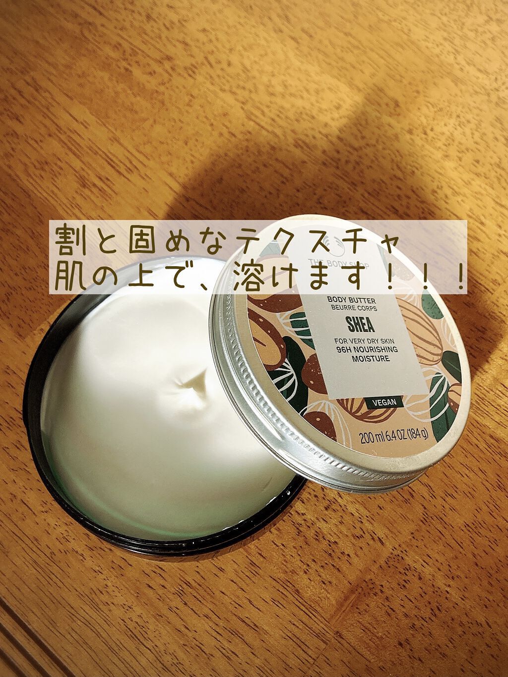 - <ボディクリーム> 97%自然由来成分配合で、格別にリッチでこっくりとしたバターのように溶ける、うるおうのにべたつきにくいテクスチャーの、シアバター(保湿成分)を配合したボディクリーム。肌を深いうるおいで満たし、しっとりやわらかな肌に導きます。 ほのかに甘く優しいシアの香りで、心なごみおだやかな気分に包まれます。 保湿成分シアバター・ババスオイル配合で、乾燥して固くなった肌をうるおいで満たし、やわらかくなめらかな肌を長時間保ちます。 <テスクチャー・仕上がり> ・格別にリッチでこっくりしたバターのような、体温でとろけるテクスチャー:エクストラリッチバター ・あと肌うっとりする保湿感 <お肌のタイプ> ベリードライスキン <シリーズ特徴>※ボディバター全種類に共通しております ー独自のバターテクスチャーで、長時間うるおいを感じる肌へー すべてのボディバターに、コミュニティフェアトレードの保湿成分シアバターを配合し、長時間うるおいをキープ。 ーヴィーガン認証ー ヴィーガン認証の代表的な存在であるヴィーガン協会から認証を受けた動物にも配慮した商品です。 ーパッケージー 100%リサイクル可能な容器は、インドのプラスチックフォーチェンジ社のコミュニティフェアトレード再生プラスチックを使用。アルミの蓋も100%リサイクル可能となっており、よりサステナブルなパッケージに進化しました。