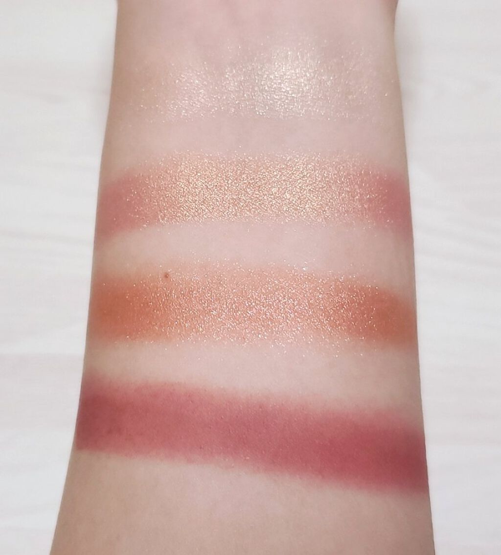 粉質はしっとりしていて 粉飛び、ラメ飛びもかなり少ないです♡ 発色は 1回だけだとふわっとつきます! アイメイクやスウォッチの写真は 2~3回くらいつけてこの発色です♡ 濃さの調節がしやすいので 使いやすいと思います⸜( * ॑꒳ ॑* )⸝