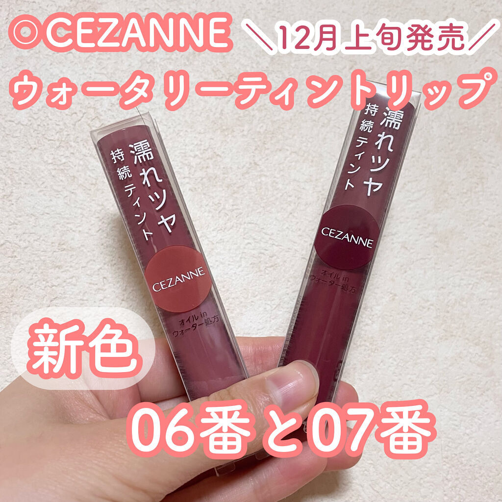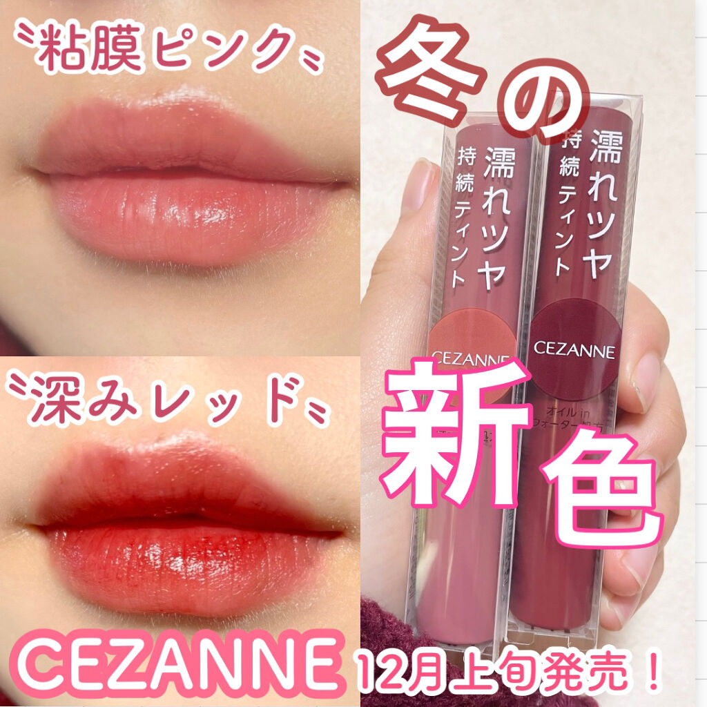 - ツヤ×色×潤いをキープする、セザンヌの新濡れツヤリップ みずみずしい濡れツヤ感ある仕上がりで、発色とツヤが長続きするティントリップです。ティントの発色を透明のベールで覆うリップコートのような処方で、ツヤ感と色をキープします。さらに、唇表面のべたつきは少なく、しっとり潤うオイルinウォーター処方を採用しています。