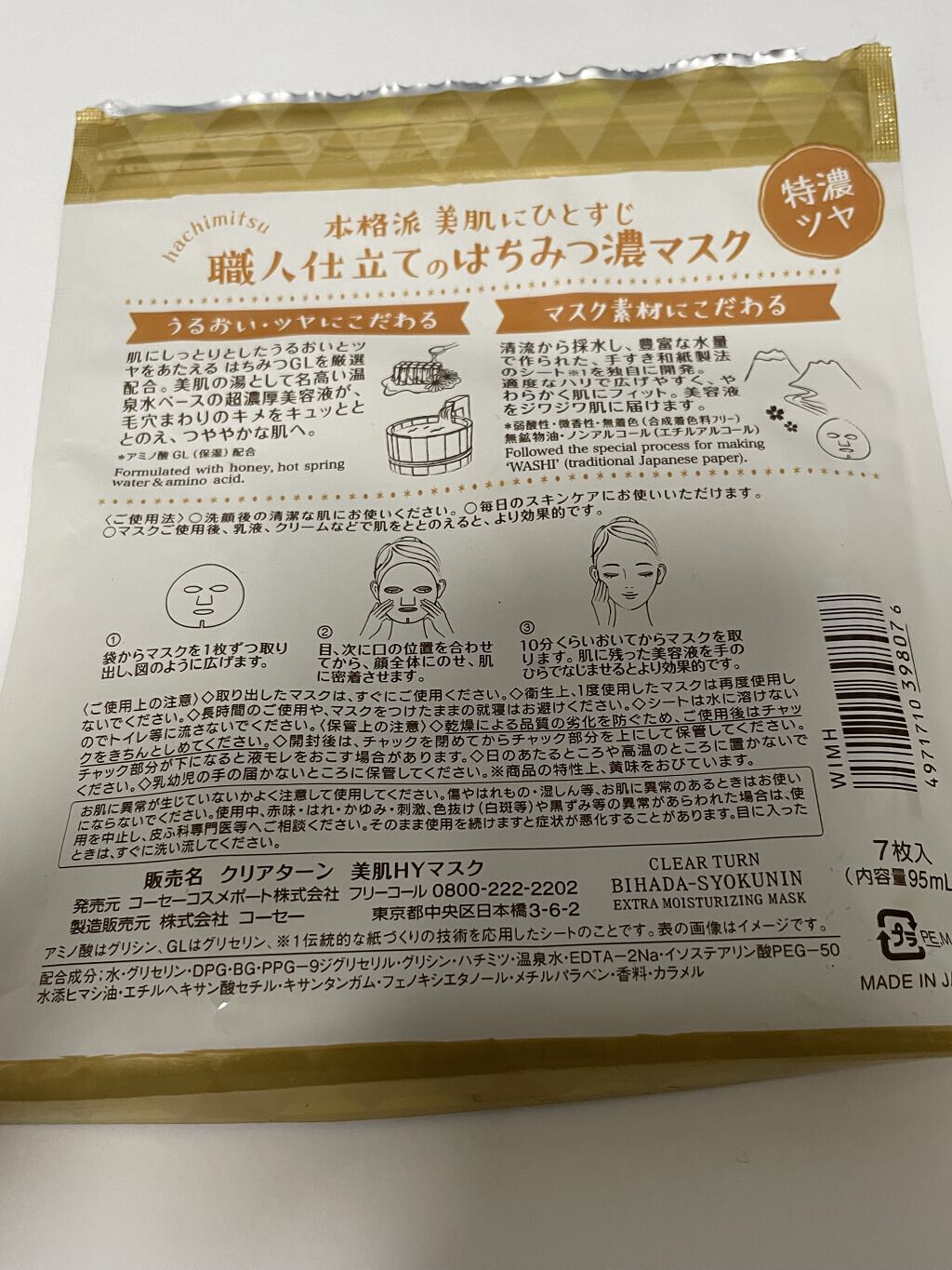 マスクの色がはちみつ色!匂いははちみつレモン!🍯🍋って感じだった!笑 クリアターンのごめんね素肌シリーズは液がひたひたって感じだったけど、こっちの美肌職人シリーズはそこまでひたひたって感じではなかった! でもちゃんと保湿されるからちょうど良い液量が入ってるって感じ!