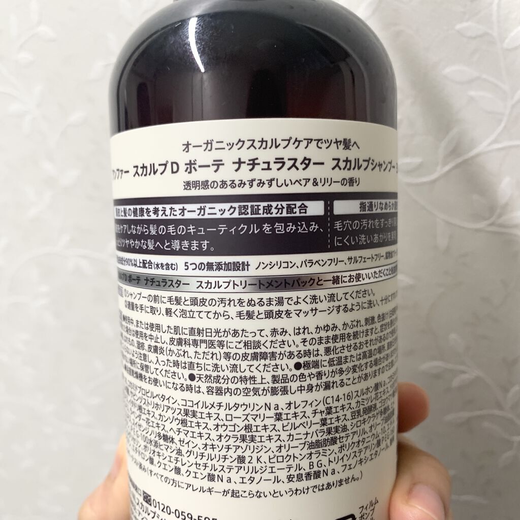 スカルプケアアイテムですが、あのスースー感のないタイプなので使いやすい。 私にはサラサラ仕上がりの為、ハイダメージの私の髪には毛先は乾燥するし、ボリュームが出るしでイマイチなところもありましたが、頭皮は、スースー感がなくてスッキリしたので、季節問わずスキでした♪ スカルプD ボーテシリーズから、オーガニック認証成分を配合した「スカルプD ボーテナチュラスター」が誕生。 クレンジング作用・キューティクル保護・豊富なミネラルをもつ“オーガニックミネラル”で本来のツヤ髪へと導きます。 香り:ペア&リリーのみずみずしい香り