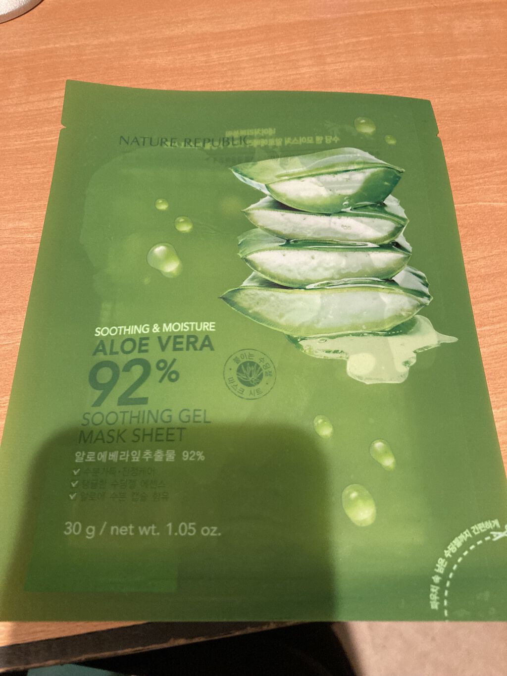 赤みが出た肌も鎮静 ぷるぷるのアロエジェルシートマスクでさっぱり保湿 アロエの治癒力凄い👏🏻 ただ、10〜20分シートマスクを付けてと書いてありますが、結構さっぱりしてるので 5枚で440円(税込)とシートマスクの中では安い方では?