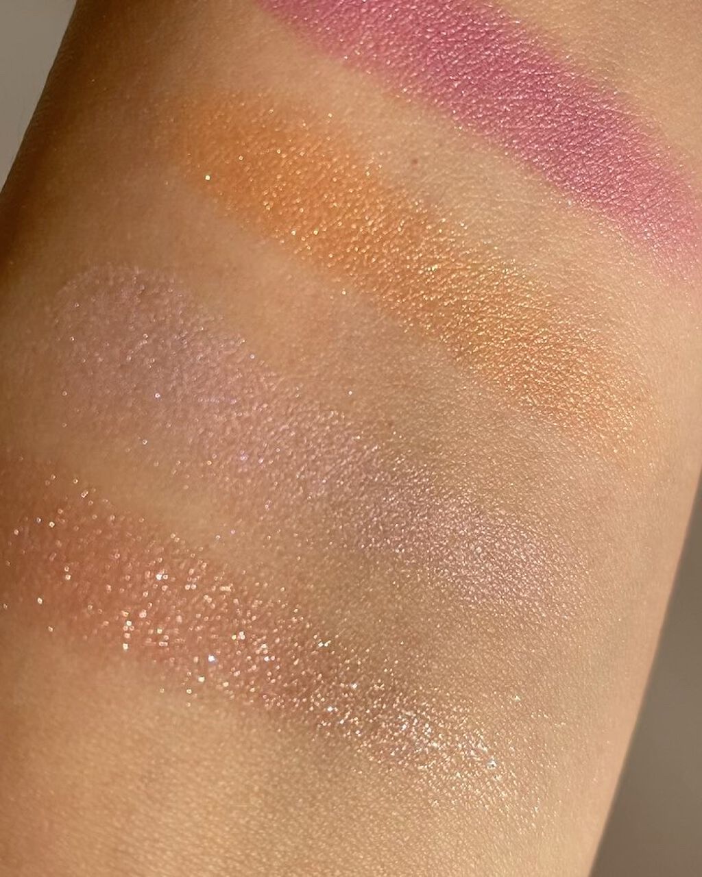 春の新色!とにかく色というよりはニュアンスカラーで透明感が出せるパレット🎨 左上のブルーの偏光パール入りのハイライトが盛れる要員!これを目頭の外側に載せるのがとっても好きです! 触ってびっくり粉質なめらかーーー😳アイカラーレーションって指で触るとすこし引っ掛かりがあるんですよね、