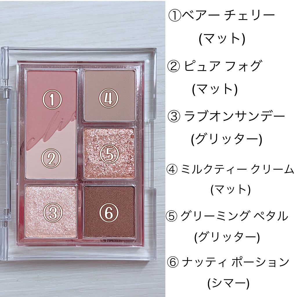 - 同系色陰影カラーと上品でクリアなグリッターの組み合わせの必要なカラーだけ詰め込んだミニアイパレット!
