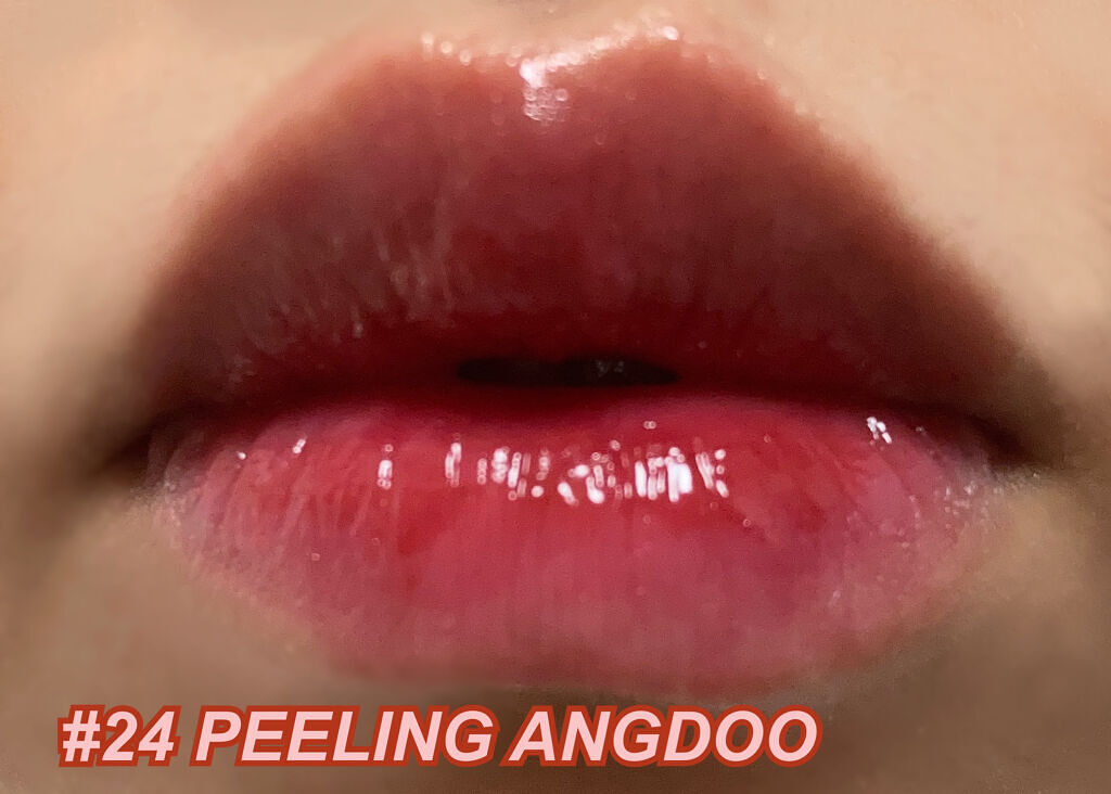 #19 ALMOND ROSE#24より少し色が落ち着いています。ローズすぎない赤みの強いローズという感じです。 #24 PEELING ANGDOO#19より赤みが強いです。パキッとしてるけど肌なじみのいいレッドリップという感じです。 2つとも同じような香りで、ジュシーなフルーツの香りです。唇に着けている時は香りはあまり気になりません。