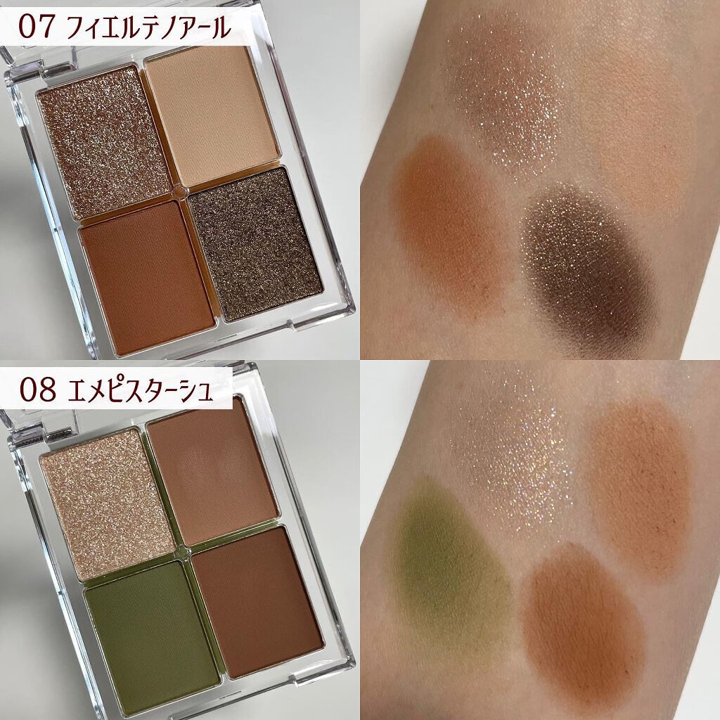 - ★オンオフ問わずマルチに活躍「4色アイシャドウ」 これ一つあれば誰でも簡単に旬の目元になれる、トレンド感のあるニュアンスカラーが4色入ったアイシャドウパレット。4色のつけ方を変えるだけで、何通りもの印象の異なるメイクを楽しむことができます。