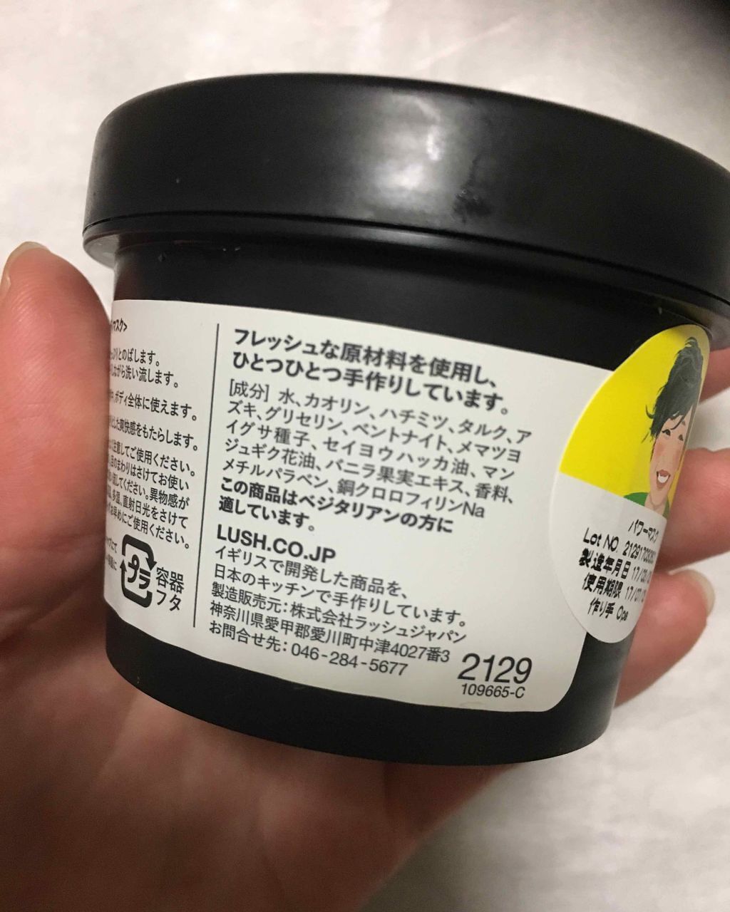 - <125g> 水、カオリン、ハチミツ、タルク、アズキ、グリセリン、ヘクトライト、メマツヨイグサ種子、セイヨウハッカ油、シオザキソウ花油、バニラ果実エキス、香料、メチルパラベン、(クロロフィリン/銅)複合体 <315g> 水、カオリン、ハチミツ、タルク、アズキ、グリセリン、ヘクトライト、メマツヨイグサ種子、セイヨウハッカ油、シオザキソウ花油、バニラ果実エキス、香料、メチルパラベン、(クロロフィリン/銅)複合体