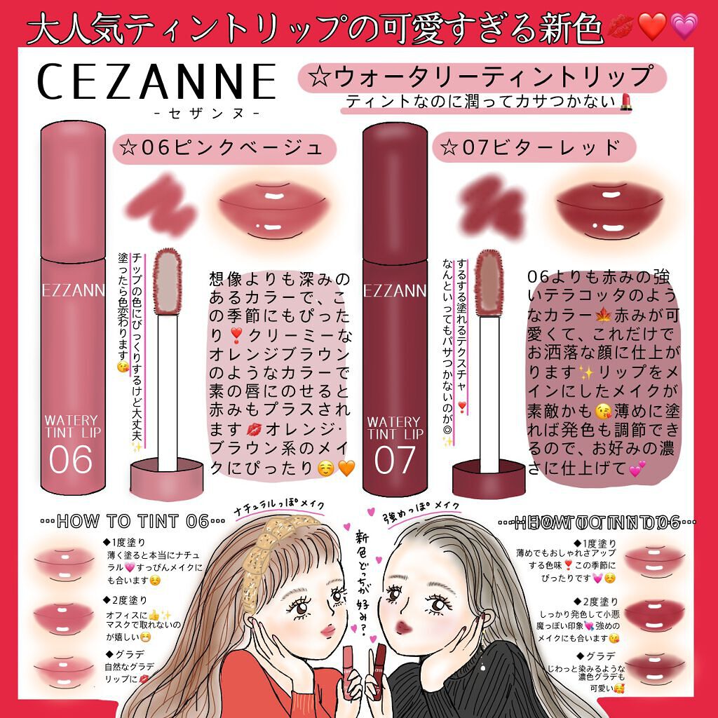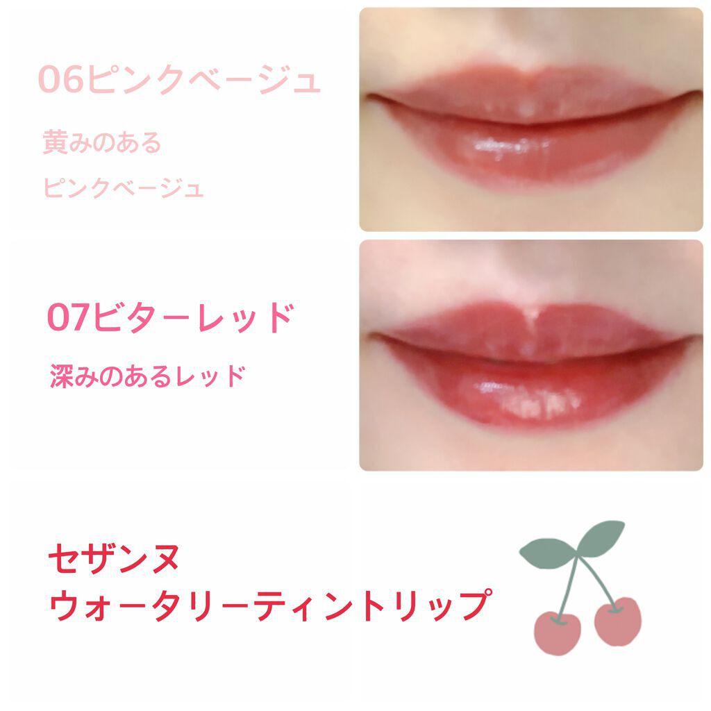 - ツヤ×色×潤いをキープする、セザンヌの新濡れツヤリップ みずみずしい濡れツヤ感ある仕上がりで、発色とツヤが長続きするティントリップです。ティントの発色を透明のベールで覆うリップコートのような処方で、ツヤ感と色をキープします。さらに、唇表面のべたつきは少なく、しっとり潤うオイルinウォーター処方を採用しています。