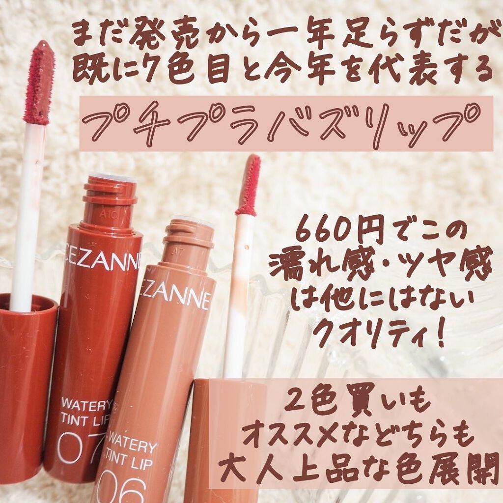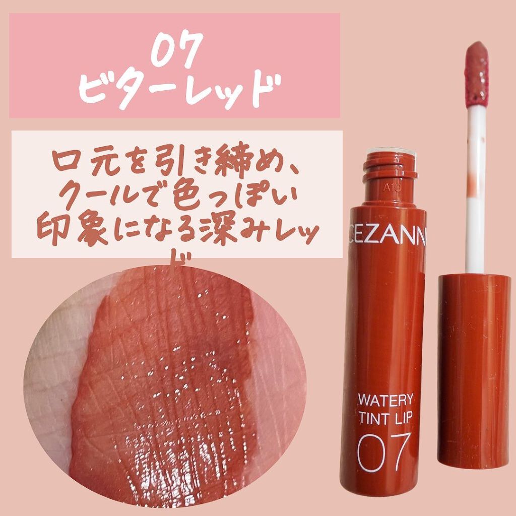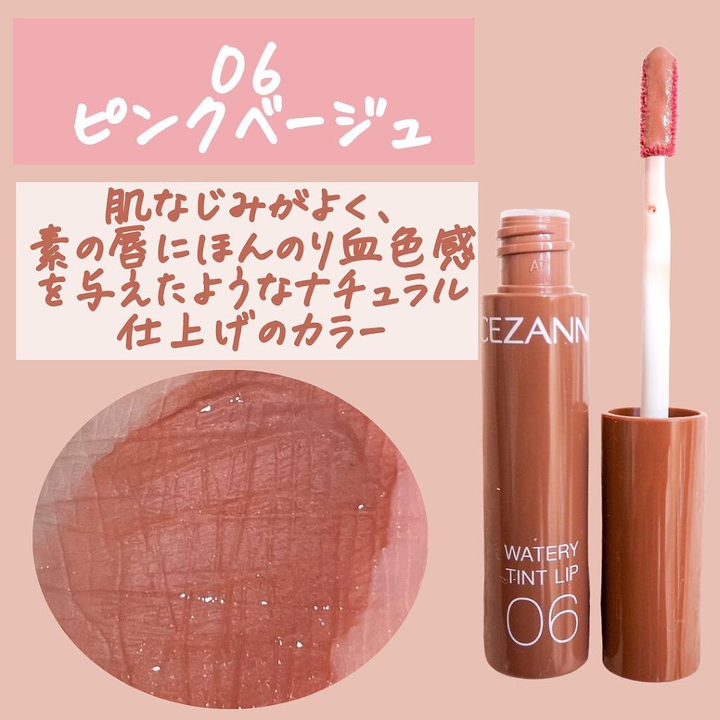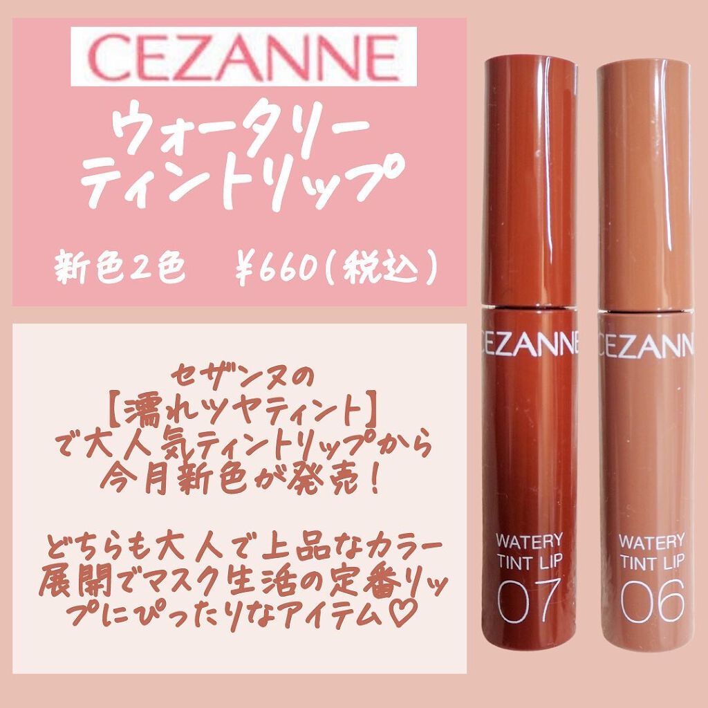 - ツヤ×色×潤いをキープする、セザンヌの新濡れツヤリップ みずみずしい濡れツヤ感ある仕上がりで、発色とツヤが長続きするティントリップです。ティントの発色を透明のベールで覆うリップコートのような処方で、ツヤ感と色をキープします。さらに、唇表面のべたつきは少なく、しっとり潤うオイルinウォーター処方を採用しています。