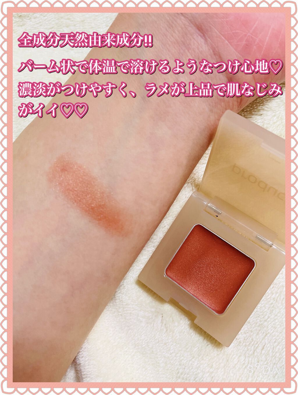 - アイシャドウにも、チークにも、リップにも、マルチに使えるカラーバーム。 スルスルっと伸びて肌に密着。美しい発色が肌を彩ります ・SKIN CARE product のこだわりである、全成分天然由来で、ブルーカモミール *¹、ラベンダー *² が 肌荒れや乾燥を防ぎ、肌を整えます。 オーガニックのシアバター *³ が肌を保湿ししっとりと肌になじみます。 (パラベン、石油系鉱物油、石油系合成界面活性剤、合成香料、合成タール色素、防腐剤、シリコーン不使用) ・MAKE UP アイシャドウにも、チークにも、リップにも、マルチに使えるカラーバーム。 スルスルっと伸びて肌に密着。美しい発色が肌を彩ります 。 ・SKIN CARE product のこだわりである、全成分天然由来で、ブルーカモミール *¹、ラベンダー *² が 肌荒れや乾燥を防ぎ、肌を整えます。 オーガニックのシアバター *³ が肌を保湿ししっとりと肌になじみます。 (パラベン、石油系鉱物油、石油系合成界面活性剤、合成香料、合成タール色素、防腐剤、シリコーン不使用) ・MAKE UP 植物とミネラルによる美しい発色が肌を彩り、輝くようなツヤ感でしっとりと肌になじみます。 手持ちのアイテムに重ねづけして、ツヤやラメ感をプラスするのもおすすめ。 マルチに使えるので、色味にあわせてアイシャドウだけでなく、チークやリップにも。 *¹ カミツレ花油、*² ラベンダー油、*³ シア脂 (全て保湿成分) ※ご使用後はクレンジングをお勧めします。