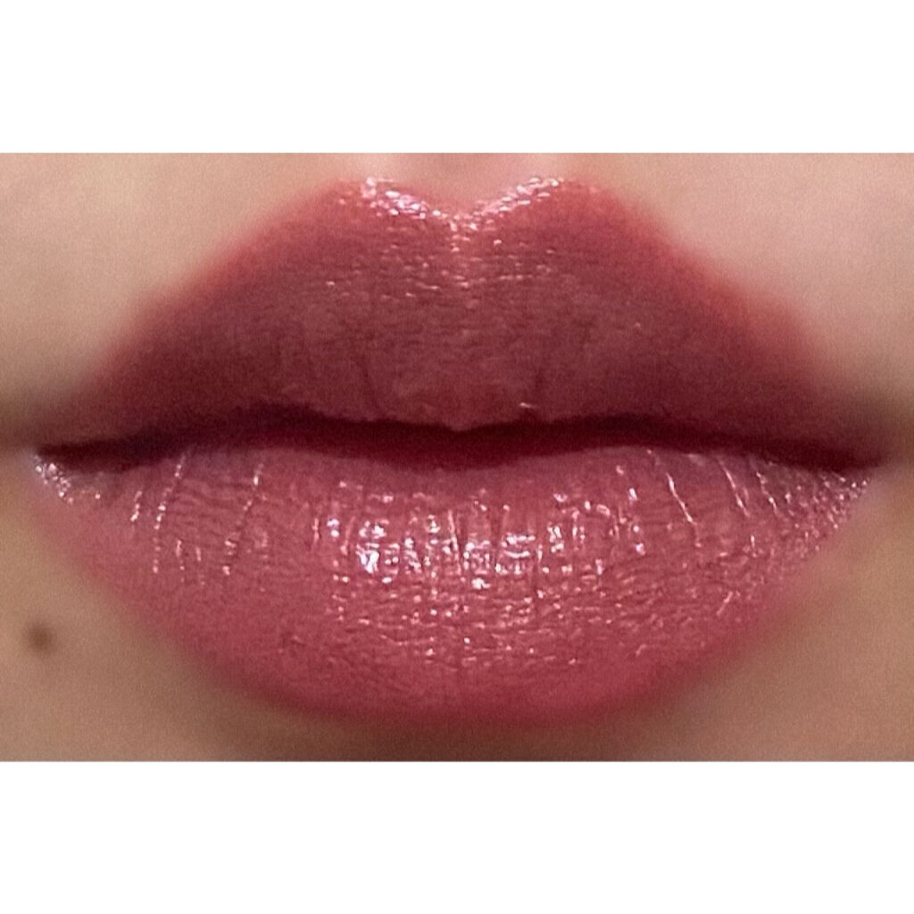 発色は一度塗りだと透け感がある感じで 重ねれば重ねるだけよく発色します。 ツヤ感のあるリップでスルスルと塗れます。 ツヤ仕上がりでティントでもないので 色持ちは喋ってるだけで一瞬で落ちるというわけではないですが 飲食をしたら普通に落ちますし マスクにもつきます。 個人的にこのリップで苦手なのはにおいです。 我慢できないほどではないのですが THE化粧品といいますか マダム感といいますか..