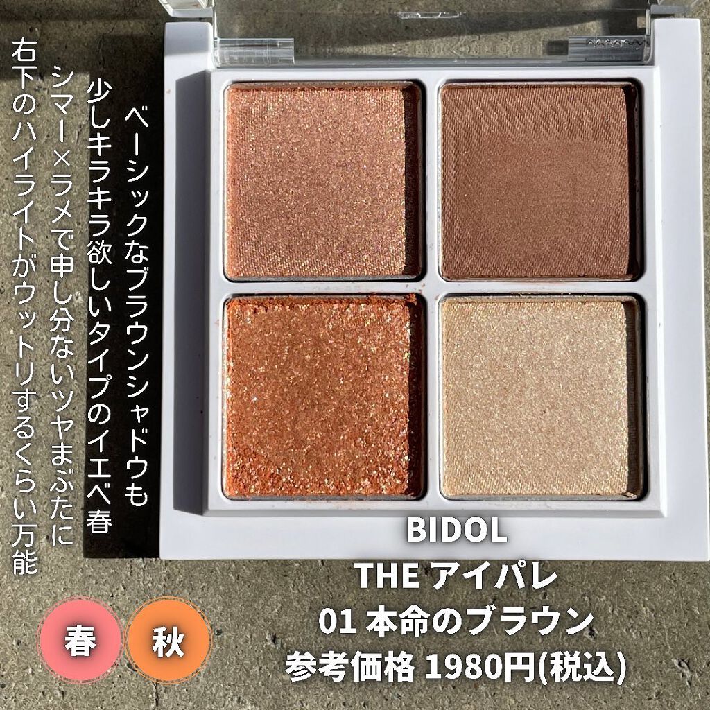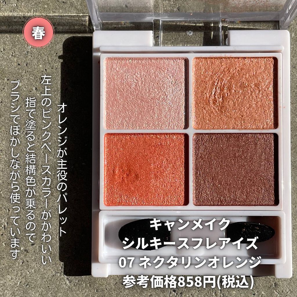 粉質がとにかくしっとり…!デパコスで感じるやつ…! どのパレットもブラウンベースで普段使いしやすいカラー展開です。 オレンジベースにシルバーラメが混ざっていたり コーラルベースにローズピンクやココアブラウンが混ざっていたり! あまり偏らずに使えるのがこれまた好きなポイントっ🫶 かっこいい雰囲気ならウインターグレイ、女性的な雰囲気ならティーローズ、大人っぽいならイノセントピーチ、カジュアルならオレンジアーモンド パーソナルカラー分からないよ〜という方は 過去投稿に似合うコスメを選ぶポイント上げているのでやってみてね🥰