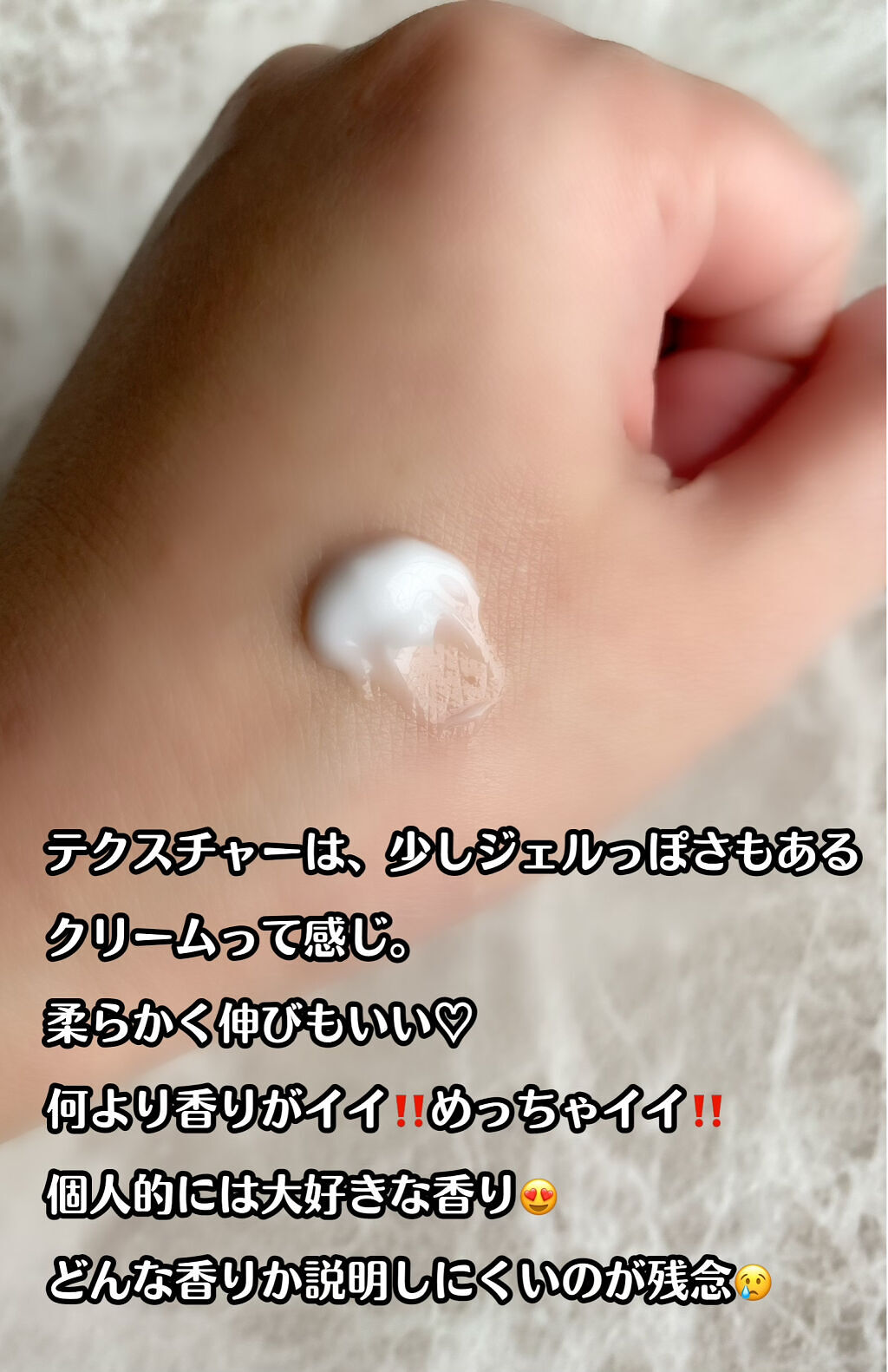 べたつかないのにしっとり保湿感 たっぷりのセラミド高保湿クリーム🩶 高保湿で潤いを逃しません! 長時間潤い続けてくれるので、肌を触る度にもっちり柔らか肌を実感でき感動しました✨ 果物と花の香りが合わさったフルーティーなフローラル系の香りは、デパコスのような上品で柔らかな香りで一生身に纏っていたいと思うほどお気に入りです💎