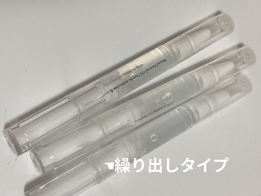 繰り出しタイプで、先端のブラシは筆タイプ 筆なので、甘皮ケアオイルも爪も縁にフィットしやすい形状になっており、しっかり隅まで塗れるのがいい所です 液はサラサラでベタベタはしないけど、あまり浸透もしない感じで保湿力も低めですが、個人的にはベタベタが苦手なので🙆♀️