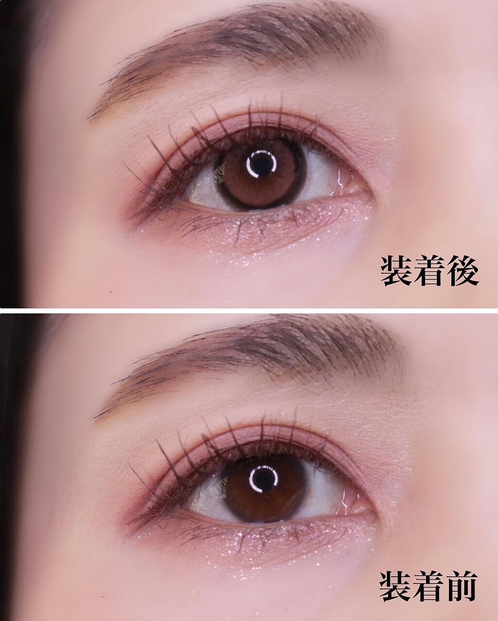 暖かい目つきを完成させてくれるウォームトーンチョコカラーブレンドで、鮮やかなチョコリングを演出🤎 赤みを感じるカラーで、ピンクブラウンのようにも見えます👀🎀 シリコーンハイドロゲル素材なので着け心地もよく、ゴロゴロ感など感じませんでした👍🏻✨