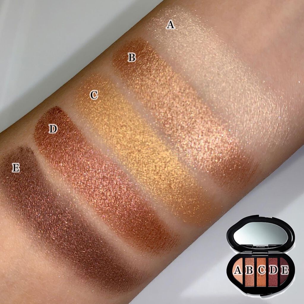 今回の新色は"まぶたに濡れたような光沢を放つ艶、光を操る立体感をプラスしリュクスなまなざしを叶えてくれる"というプリズムフォーミュラ。 確かにいつもとはちょっと違う…良いですこれ🫶❤️ ヌメッと面で光るようなツヤ感✨ テクスチャーは刻印ありタイプ、ツヤはクリームタイプに近いと思います🥰 要は刻印ありとクリームの良いとこ取りですね! ゴールドと柔らかいレッドの組み合わせ。アプレスキーとエレクトリックチェリーの中間のような色合い🤔 ゴールドとピーチカラー。今回の3色の中では一番黄みが強い。 青みがかったローズが可愛い。ぱっと見はわからないけど左上にみんな大好き青ラメが…!!
