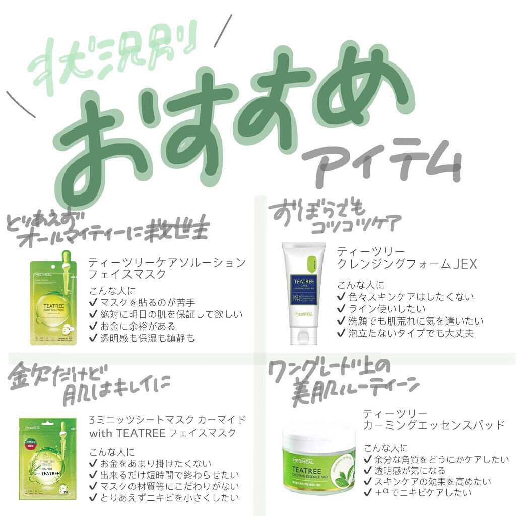 実際使ってみて...-メディヒール編-結局一番ニキビに効くのは??ランキングこんにちは、𝙠𝙖𝙡𝙞𝙣です🕊今回は今まで使ってきたニキビに効くと言われているメディヒールの物で私が実際使ったものをきちんとニキビに効いたと私が感じた順にランキングを付...
