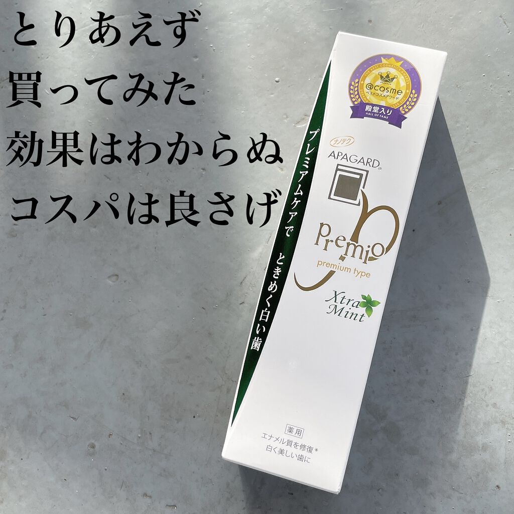 - 【医薬部外品】 独自成分「薬用ハイドロキシアパタイト」がエナメル質を整えてむし歯を予防。アパガードはエナメル質の健康を保つことで自然な白い歯に導く美白歯みがきブランド。アパガードプレミオは「薬用ハイドロキシアパタイト」を高配合(スタンダードタイプ比)。プレミアムケアでときめく白い歯に。 <ライトミント> ●サンギ独自の薬用成分ナノ粒子「薬用ハイドロキシアパタイト」を高配合したプレミアムタイプ。※Mプラス、スモーキン比 ●歯の再石灰化率、白色度もアップ。 ●歯垢を吸着除去し、歯のエナメル質の目に見えない傷を埋め、ミネラル欠損部(初期むし歯)を再石灰化するナノ<mHAP>の3つの働きで、むし歯を予防。 ●パール成分(加水分解コンキオリン液)配合。 <エクストラミント> ●強めのミントがお好みの方におススメ!ミント強めの「エクストラミント」フレーバー。 ●サンギ独自の薬用成分ナノ粒子「薬用ハイドロキシアパタイト」を高配合したプレミアムタイプ。※Mプラス、スモーキン比 ●歯垢を吸着除去、エナメル質表面の目に見えない傷を埋めてなめらかに、エナメル質から溶け出したミネラルを補給(再石灰化)する、という薬用ハイドロキシアパタイトの3つの作用でむし歯を予防。 ●パール成分(加水分解コンキオリン液)を追加したブライトニング処方