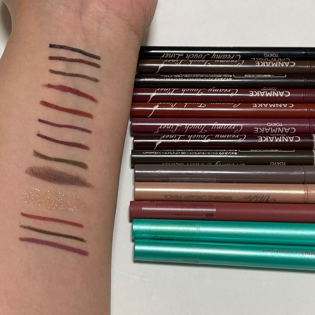 名前の通り黒。一番目元をくっきりさせたい時はこれ。 濃いブラウン。ブラウンで締めたい時はこれ。とはいえ、02を使うので使用率低め。 オレンジ🍊のようなキャラメルカラー。オレンジや黄味が強い時はこれを使います。 濃いめの紫。秋メイクでは出番が多い。 可愛すぎるピンク。ミルキーなピンクブラウンなナチュラルに可愛い。下瞼の粘膜はこれしか使ってないぐらい好き💕これも何本もリピ。 グレー。これも使いやすい!!上瞼は悩んだらこれを使っておけばなんとかなるカラー。黒のようにパキッとしすぎないので、自然に目力アップする😀 鮮やかなピンク。春夏にはぴったりのカラー😍 ミルキーコーラルのようなカラー。これも可愛い😍。アイラインとして線がパキッと出るわけではないので、ほんのり際に仕込んでます. 10より黄味がないので、ミルキーなカプチーノぽいカラーが本当に使いやすい。最近はこれが一番好き💕そして1番出番が多い。