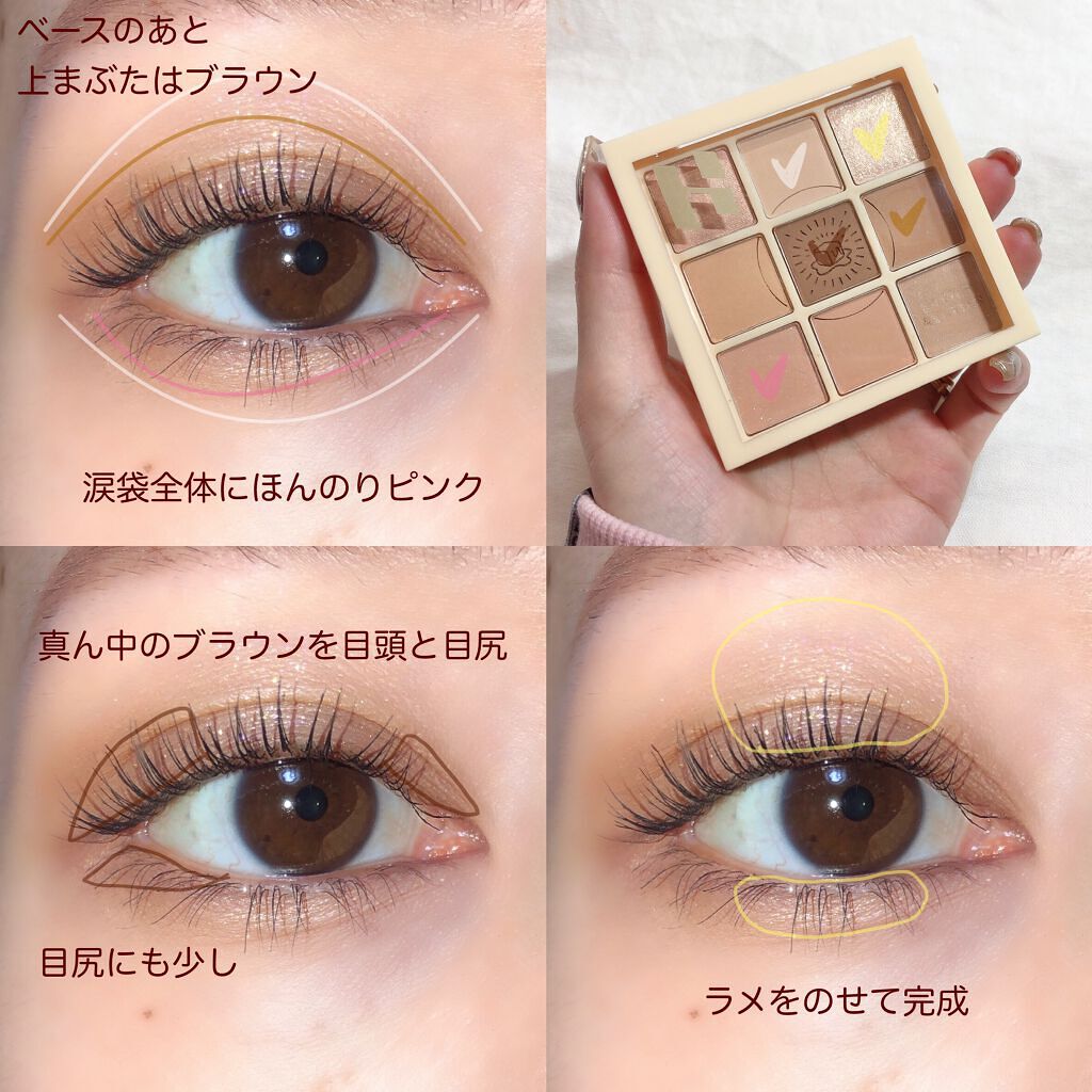 ベースメイクをパウダーファンデでなるべく薄めにしあげています。あまりにも粉っぽくベースを仕上げるとマットアイシャドウの付きが悪くなりそうな気がするので(なんとなく)…😅 パレット左上のベースカラーだけはアイシャドウブラシ(大)それ以外は(小)のブラシで塗っています! 涙袋の影は付属のブラシの細い方で。仕上げに涙袋に左上のベースカラーを少しのせると涙袋がふっくら見えてオススメです◎!