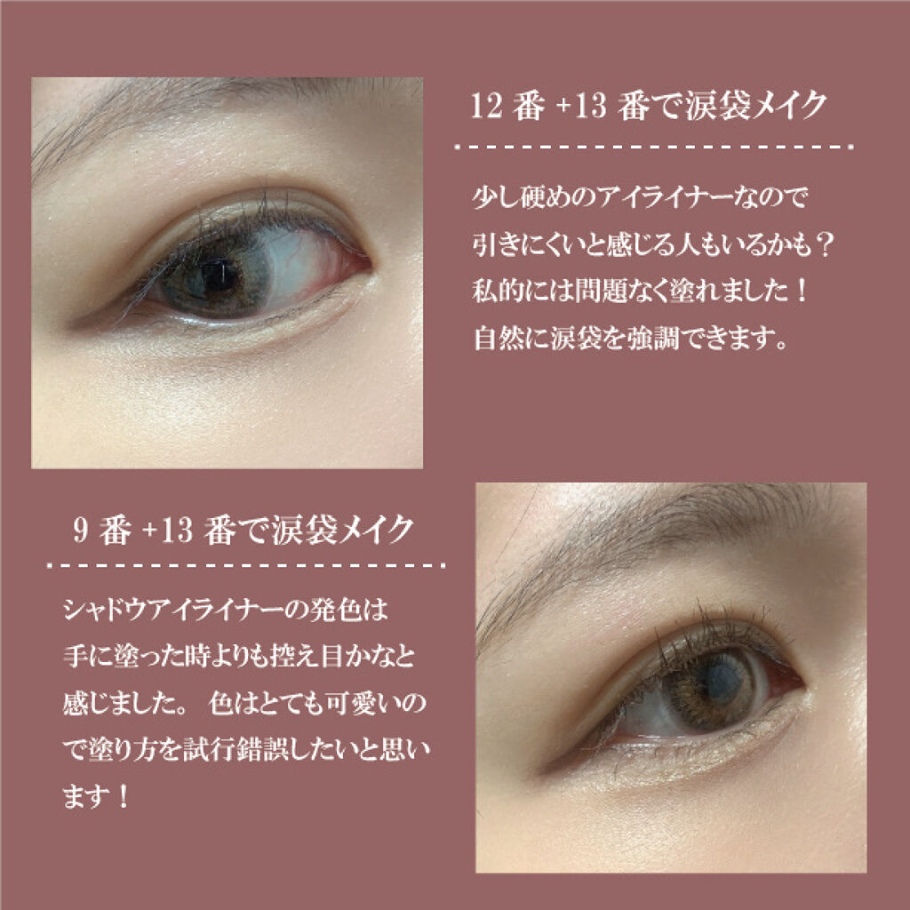 - アイライナー、シャドウ、涙袋、コンシーラーまで様々に活用可能な4in1マルチアイライナー。 一度のタッチで鮮明で素早くフィクシングする滲みにくいラインを演出。ソフトな使用感で初心者でも簡単にアイメイクアップを完成できます。 皮膚刺激テスト完了*。敏感な目元でも使用可能です。 ウォータープルーフテスト完了でアイメイクを長時間維持できます。 フランスのEVE VEGANからヴィーガン認証を獲得したヴィーガン製品です。(01~13該当) *全ての方に皮膚刺激が発生しないということではありません
