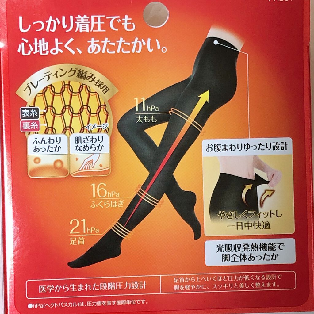 足首から上へいくほど圧力が低くなる設計(足首21hPa、ふくらはぎ16hPa、太もも11hPa)で、脚を軽やかにスッキリと美しく整えてくれるんだって♪ 履いた後は程よい着圧で履き心地いい!! 苦しくないけど着圧してくれている感じもあるの。 プレーティング編みもいいね! なめらかな肌触りで気に入りました♪ 見た目も艶やかな黒でいいよ!