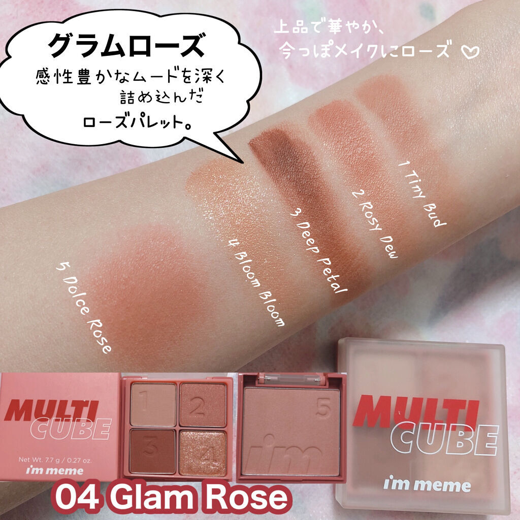 持ち運びに超便利!i’mmemeマルチキューブ004グラムローズアイシャドウとチークが一つになったコンパクトキューブ!ベース色からラメまでさらにチークも全てが揃った便利すぎアイテム!旅行にも!普段のバックにも!粉質は割と柔らかくて発色もとても...