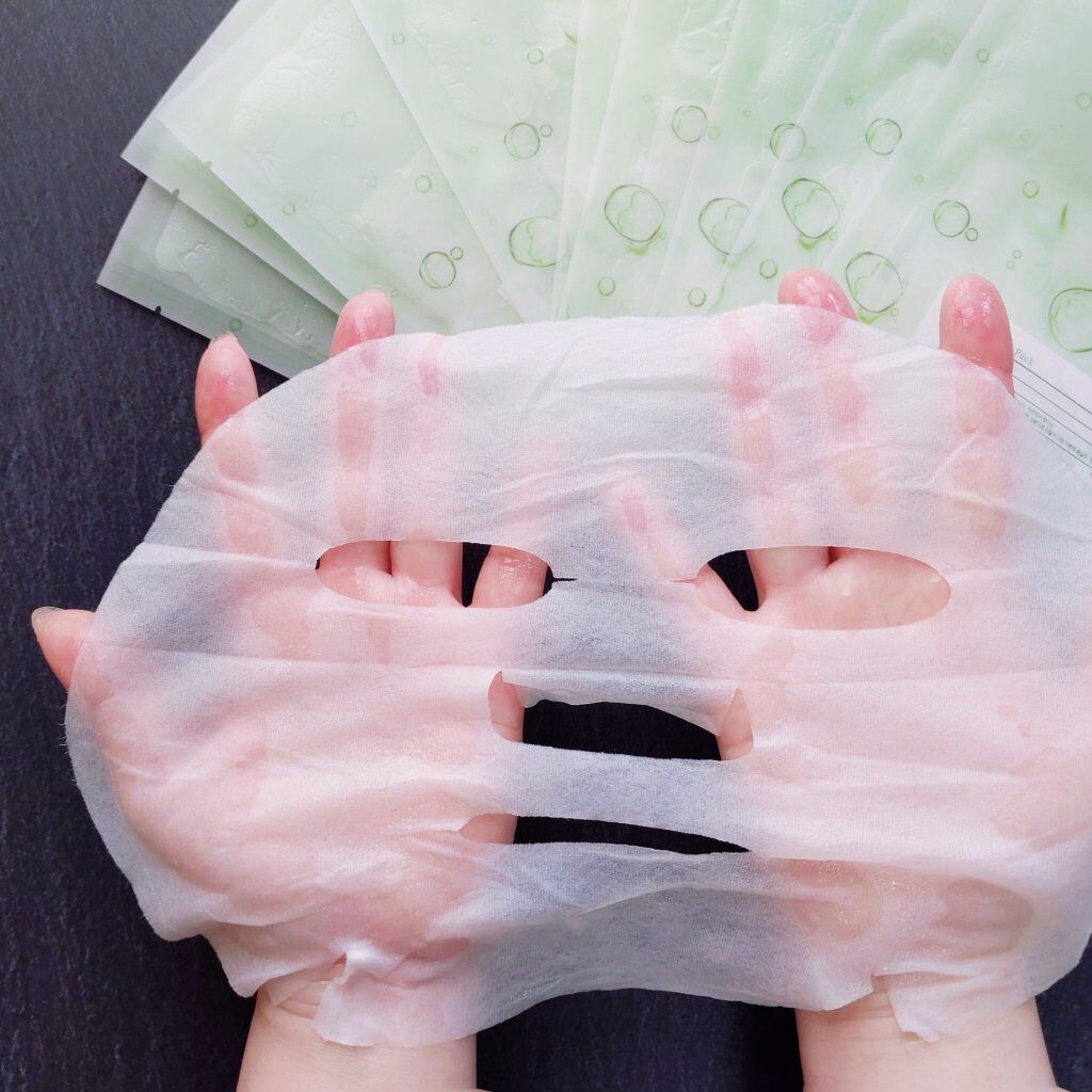 シートはひたひた美容液の中に👀 肌あたりが優しく、3層構造の厚手のふっくらシートは、日本人女性の平均顔型をもとに作られたそう。 ストレッチが効いているシートなので、グイッと引っ張って伸ばすこともできるので小鼻にもピタッと貼ることが出来ます👏 化粧水タイプのフェイスマスクなので、毎日使えるのも嬉しいポイント◎