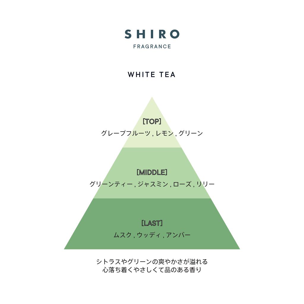 shiroホワイトリリー使用感のメモ香りのノートTOPベルガモット.ブラックカラント.グリーンMIDDLEリリー.ジャスミン.ローズLASTアンバー.サンダルウッド.ムスク香りの特徴自然素材で作られているので、フィアンセのようなトゲトゲしさが...