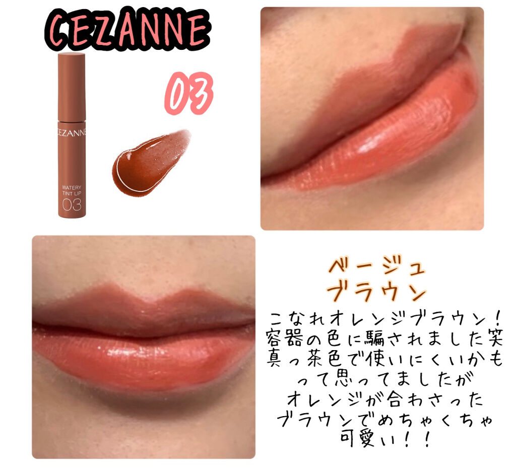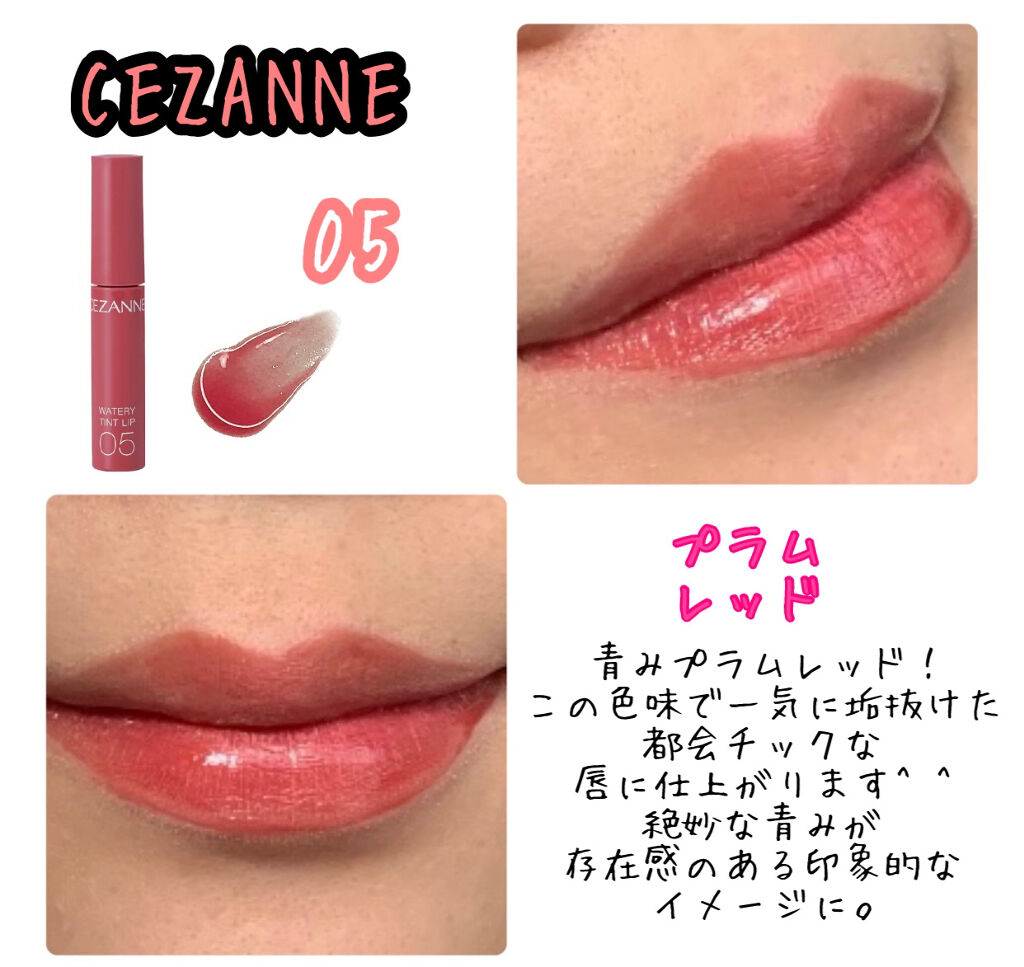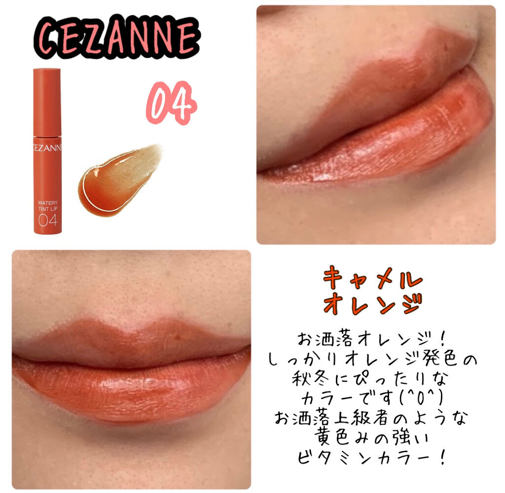 - ツヤ×色×潤いをキープする、セザンヌの新濡れツヤリップ みずみずしい濡れツヤ感ある仕上がりで、発色とツヤが長続きするティントリップです。ティントの発色を透明のベールで覆うリップコートのような処方で、ツヤ感と色をキープします。さらに、唇表面のべたつきは少なく、しっとり潤うオイルinウォーター処方を採用しています。