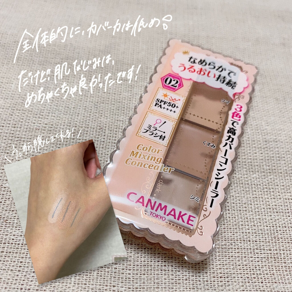 3色入りなので悩み別に使い分けができます☺️ 手頃なお値段なのに鏡、ミックススペース、ブラシがついています𖧷 カバー力はそこそこあります🙆♀️ 固すぎず使いやすいですが、若干乾燥で粉吹いてくるのでメイク前の保湿はしっかりする必要があります