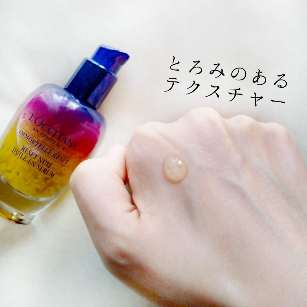 ロクシタンの人気美容液がリニューアル! ボトルの中で輝く黄金のオーガニックのイモーテルエッセンシャルオイルカプセル*使うたびにはじけて新鮮な美容成分を届けてくれるんです。 肌に触れた瞬間、ふわっと広がるイモーテルの香りに贅沢なナイトケアタイムを過ごしているように感じます。 この1本で簡単にプロ級のスキンケアができちゃいます!!