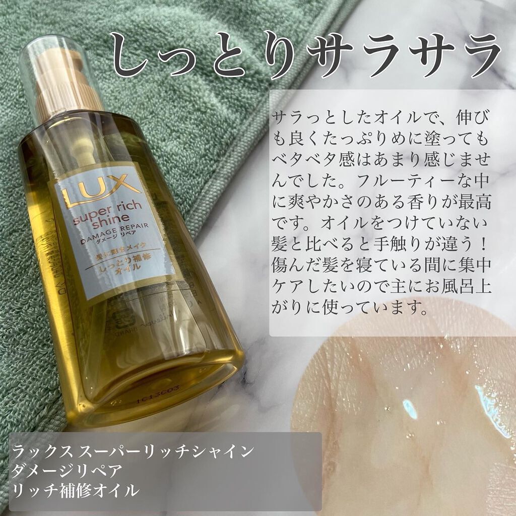 【LUXスーパーリッチシャインダメージリペアリッチ補修オイル】\ダメージでからまる髪にシルクのような指通りの髪へ‼️/ジューシーフルーツとフローラル💐の香り。とろっとしていますが手の平で伸ばしている時にはスルッと伸びてサラサラとしたテクスチャ...