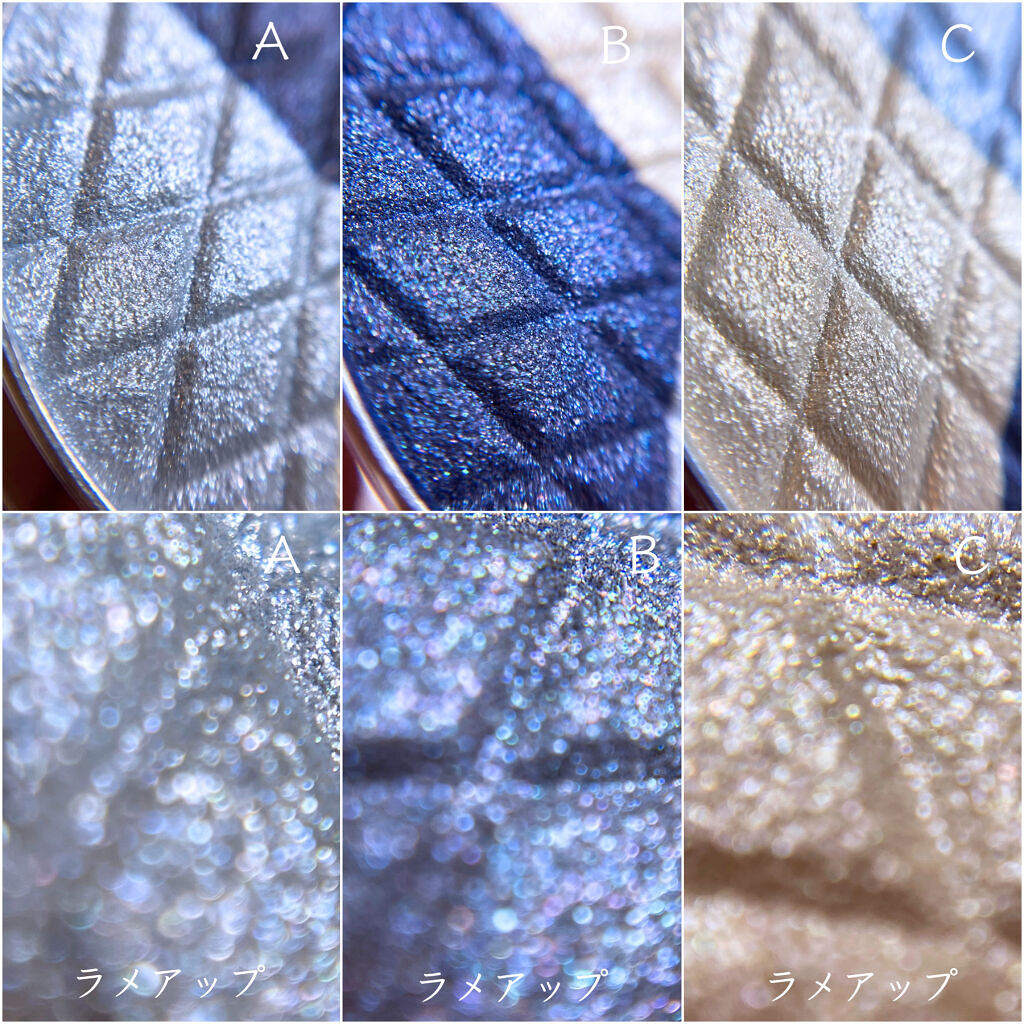 - ラメ・偏光パールの質感が集まった3色パレット。立体感も陰影も輝きも自由自在で、目元を美しく鮮やかに演出します。瞳に透明感を与える微粒子パール・偏光パールを使用し、目元に立体感を与えます。