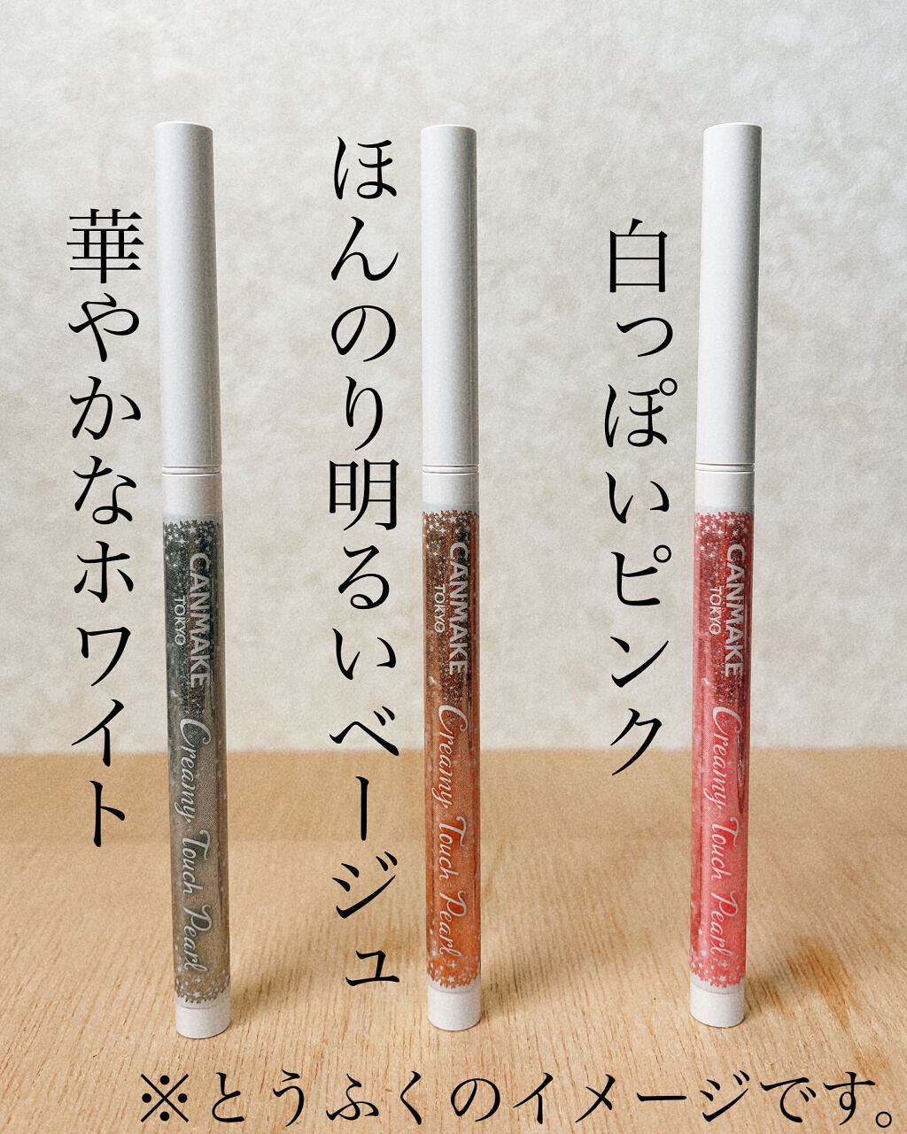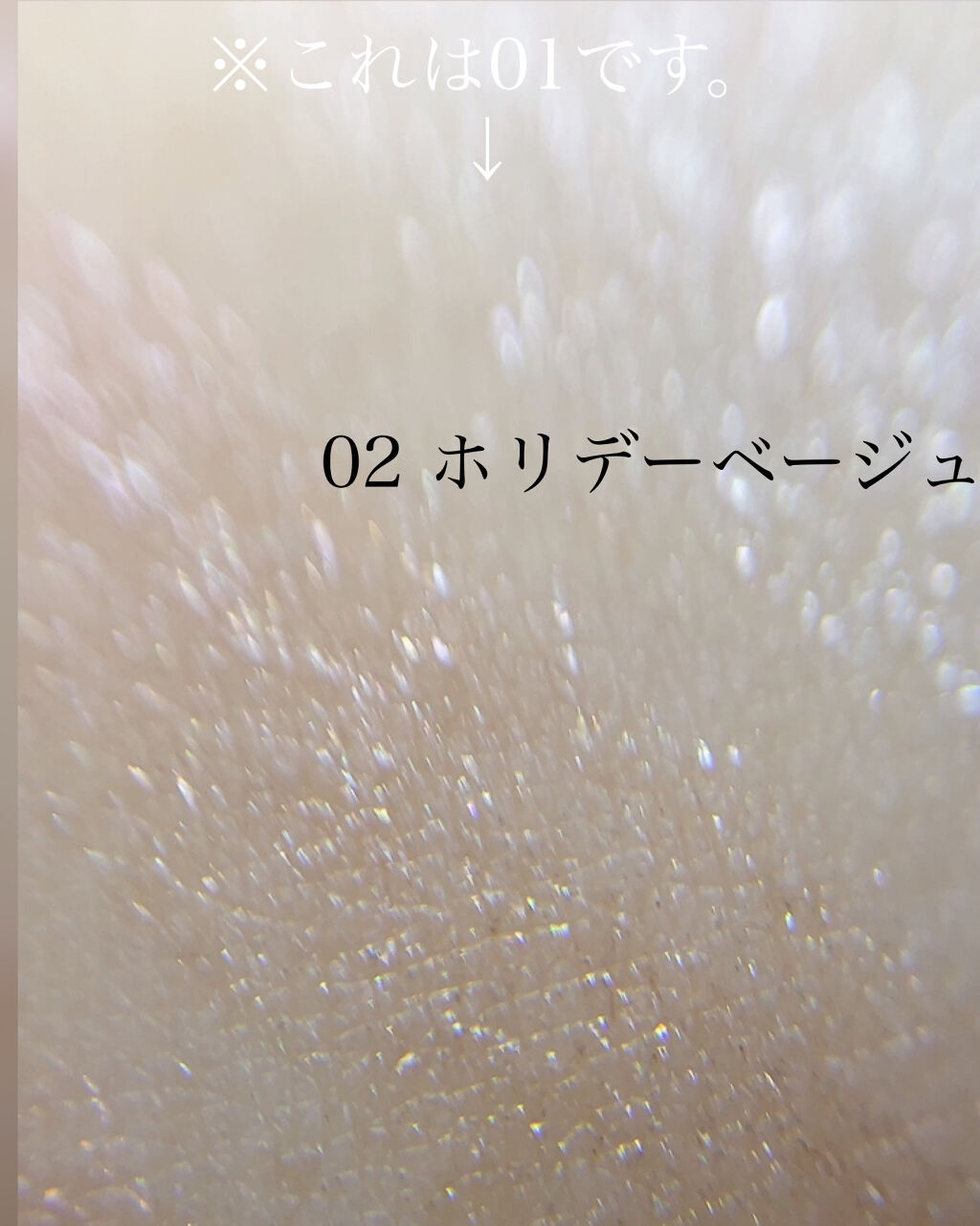 700円で買えて、しかも落ちにくく、涙袋がずっと綺麗にキープ😍 ただ、01もホワイトパールでキラキラ輝くのがたまらなかったので購入◎ 02はベージュ系でブラウンやオレンジメイク 03はピンク、パープルメイク 涙袋意外にも、アイラインの上にポンポン乗せたらラメ入りになってかわいかったです✨