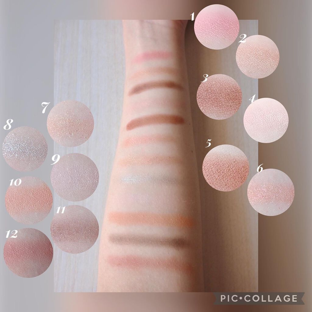 私が使用したのは「ソフト発色の絶妙なモーヴカラーで 血色感のある上品な雰囲気に」と公式の説明にある通り、 ふんわりくすみカラーがとってもかわいいんです🥹 ラメ入りのチーク大好きなのでこれは本当に刺さった...🥹 2はグレーがかった色にも関わらず顔色が悪くならず、 透け感のある色味だったので二重幅に沿ってほんのり 使うことで透明感があるメイクになった気がする! 3を涙袋と黒目の上に使用しましたが、濡れ艶って 感じのラメでハイライト効果も抜群🥹✨ 4は3よりさらにピンクみの強いメイクがしたい時に おすすめのカラーで、こちらもラメが可愛い! 5,6はどちらも目尻に使用していますが、5はラメ入りで 艶やかなので、より華やかさを重視したい時に 使っていこうかなと思っています!! 今までもエチュードのアイシャドウは大好きで いくつも使ってきましたが、今回はより発色もはっきりと していて質感も使いやすい気がするので(個人の感想😂) ぜひ皆さんもチェックしてみて✊🔥