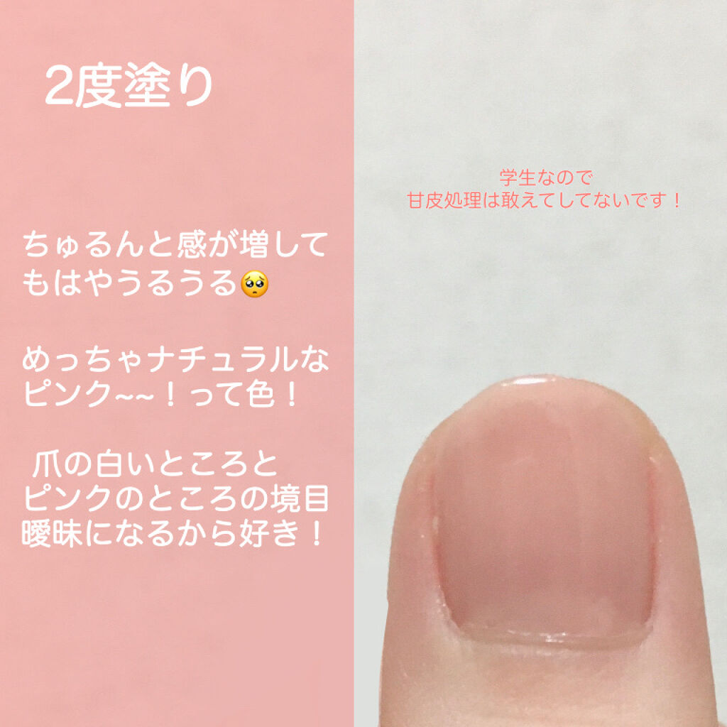 キャンメイク NBC ベースコート 健康的なピンク色! The女の子って感じの色です~~!! 1度塗り⇢ 校則厳しめのスクールネイルに! ほどよいツヤ感がたまらん、、🥺 美爪の方がよく使ってるイメージのある、 (わたしの偏見ですが…笑) ettusaisのクイックケアコートと違って 透明感のあるピンク色なので、 血色感があって本当にかわいい!!! 2度塗り⇢ 校則緩めのスクールネイルや 露骨にネイル感出したくない方に✨ ほどよく爪の白いところとピンクのところの 境目を消してくれるので、 多少爪が長くても不潔感がない!!! わたしは2度塗りしてます🙌🏻 3度塗り⇢ デートのときや、社会人の方に💎 透明感あるピンクのネイル塗りました!って感じになります(語彙力) とーーっても可愛いので、お出かけの時に さりげないオシャレがアピールできます!笑 また、大人の女性がつけてても 清楚な雰囲気出まくってて素敵だと思います🥰
