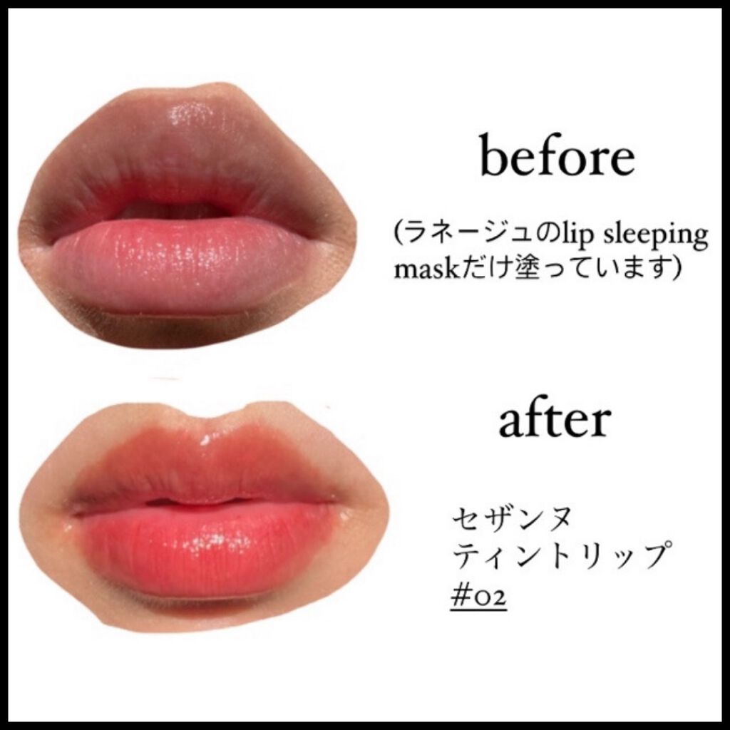 - ツヤ×色×潤いをキープする、セザンヌの新濡れツヤリップ みずみずしい濡れツヤ感ある仕上がりで、発色とツヤが長続きするティントリップです。ティントの発色を透明のベールで覆うリップコートのような処方で、ツヤ感と色をキープします。さらに、唇表面のべたつきは少なく、しっとり潤うオイルinウォーター処方を採用しています。