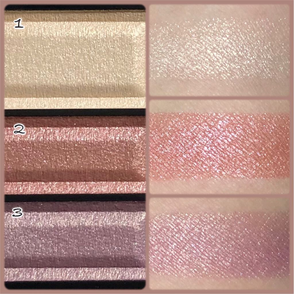 全体的には、名前のとおりヌーディーな印象☺️定番色「01 本命のブラウン」と似てるんだけど、今回の「104 本能のヌードベージュ」の方が、よりヌーディーなカラーとなっておりまする💁🏻♀️ 左上のベージュカラー(1番)は、基本的にはマットカラーなんだけど、ほんのりラメも入ってるから、のっぺりとした印象にならなくて良き🥰 4番のカラーは、ハイライトとして使うこともできるし、個人的には涙袋に使っても良いのではないかと思っておりまする👻 こちらは、全体的にしっとりとしたテクスチャーとなっておりまする💖そして、上2色のマットカラーが、結構しっかり発色してくれます❣️ 右下のハイライトカラーも、「104 本能のヌードベージュ」ほど白っぽくならないので、さりげなくハイライトを入れたい人にピッタリ✨
