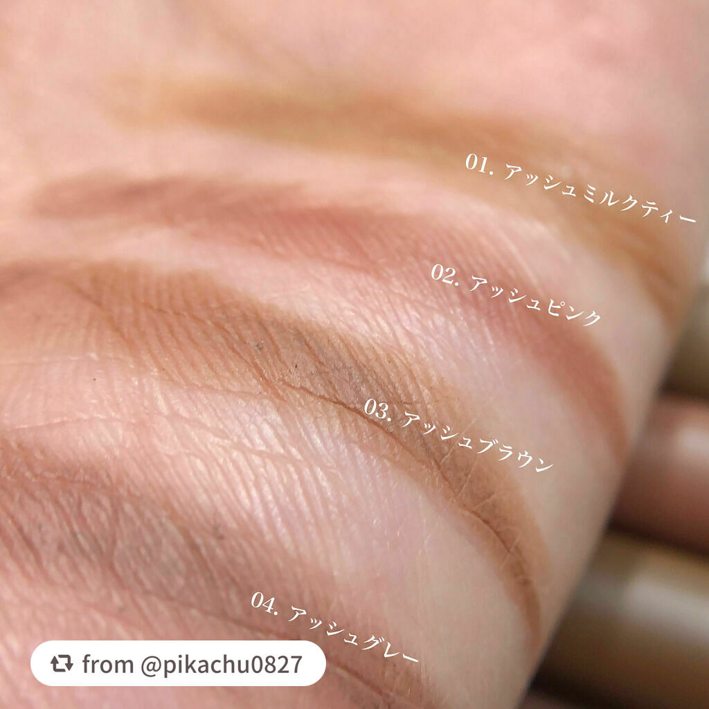 - <01 アッシュミルクティー> ベヘン酸、モクロウ、トリエチルヘキサノイン、ダイマージリノール酸(フィトステリル/イソステアリル/セチル/ステアリル/ベヘニル)、トリ酢酸テトラステアリン酸スクロース、水添ヒマシ油、セスキイソステアリン酸ソルビタン、スクワラン、ラウロイルリシン、水酸化Al、トコフェロール、シリカ、セルロース、マイカ、酸化鉄、酸化チタン <02 アッシュピンク> ベヘン酸、モクロウ、トリエチルヘキサノイン、ダイマージリノール酸(フィトステリル/イソステアリル/セチル/ステアリル/ベヘニル)、トリ酢酸テトラステアリン酸スクロース、水添ヒマシ油、セスキイソステアリン酸ソルビタン、スクワラン、ラウロイルリシン、水酸化Al、トコフェロール、シリカ、セルロース、マイカ、酸化鉄、酸化チタン <03 アッシュブラウン> ベヘン酸、モクロウ、トリエチルヘキサノイン、ダイマージリノール酸(フィトステリル/イソステアリル/セチル/ステアリル/ベヘニル)、トリ酢酸テトラステアリン酸スクロース、水添ヒマシ油、セスキイソステアリン酸ソルビタン、スクワラン、ラウロイルリシン、水酸化Al、トコフェロール、シリカ、セルロース、マイカ、酸化鉄、酸化チタン <04 アッシュグレー> ベヘン酸、モクロウ、トリエチルヘキサノイン、ダイマージリノール酸(フィトステリル/イソステアリル/セチル/ステアリル/ベヘニル)、トリ酢酸テトラステアリン酸スクロース、水添ヒマシ油、セスキイソステアリン酸ソルビタン、スクワラン、ラウロイルリシン、水酸化Al、トコフェロール、シリカ、セルロース、マイカ、酸化鉄、酸化チタン <05 アッシュオリーブ> ベヘン酸、モクロウ、トリエチルヘキサノイン、ダイマージリノール酸(フィトステリル/イソステアリル/セチル/ステアリル/ベヘニル)、トリ酢酸テトラステアリン酸スクロース、水添ヒマシ油、セスキイソステアリン酸ソルビタン、スクワラン、ラウロイルリシン、水酸化Al、トコフェロール、シリカ、セルロース、マイカ、酸化鉄、酸化チタン