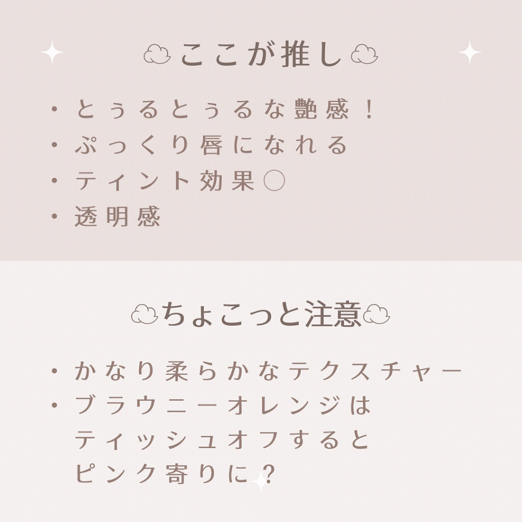 | 口紅・グロス・リップライナーランキング第12位 | シロップのようにとろーりしていて 唇にのせると密着してくれる。じゅわっとした発色とむっちり感が たまらなくよかった⸝⸝⸝♡ | 詳細を見る | |