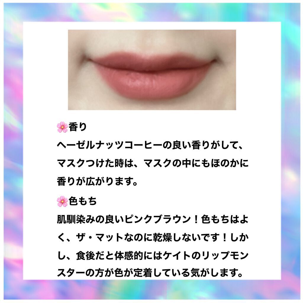 マットインクという名前だけあって、ほんっとにザ・マットリップという感じです。 色がピンクブラウンということもあってとっても肌馴染みが良く、色もちもいいので唇色薄人間としてはとてもありがたい商品だと思いました! このリップを塗ると、何故かいつにも増して親族(50代)からお褒めの言葉を頂きました。 そして、チップの先端が尖っているので、狙ったところに塗りやすいです。 個人的には綿棒で縁をぼかすのが気に入っているので、唇の縁から1ミリ離した内側部分だけをを塗りたいという私の願望も簡単に叶えられます。