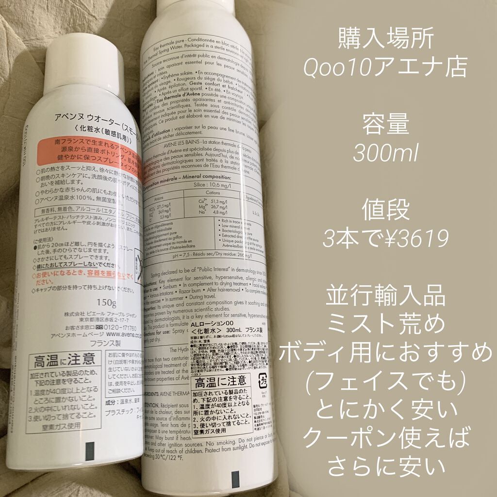 導入化粧水にも近く、なんというか肌の底力を引き上げてくれるかのような、縁の下の力持ちのような… 吹き出物が出来ると、悪化が怖くてむしろなにもつけたくない時でさえアベンヌなら安心して使用できます。 お風呂上がりにタオルドライした後、アベンヌを全身に振り撒きます。それから化粧水等々やボディクリームを塗ったくります。 サイズ展開は下記の3タイプ。 正直、資生堂から販売されている日本正規品は高いです。スプレータイプのフランスからの輸入品だからというのもありますが… フランスではアベンヌ製品ふおよそ半額〜三分の一の値段らしいです…🥲 今回はQoo10でクーポンがあり、販売店もしっかりしたアエナがあったのでそちらで購入。ですがフィルム梱包がなかった為、そこはマイナスポイントでした🤔