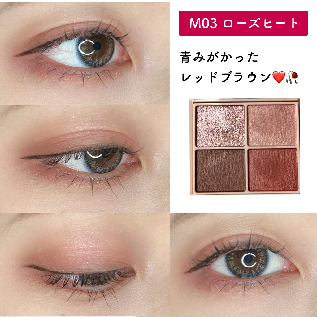 - シルキースフレアイズの姉妹品♡ 肌に溶け込むような透けマットシャドウ 透け感のある柔らかい仕上がりになるマット3色と、透け発色の繊細ラメ1色のパレットシャドウ♡ 完全マットアイや、ラメ×マットアイなど、メイクのパターンを楽しみましょう!